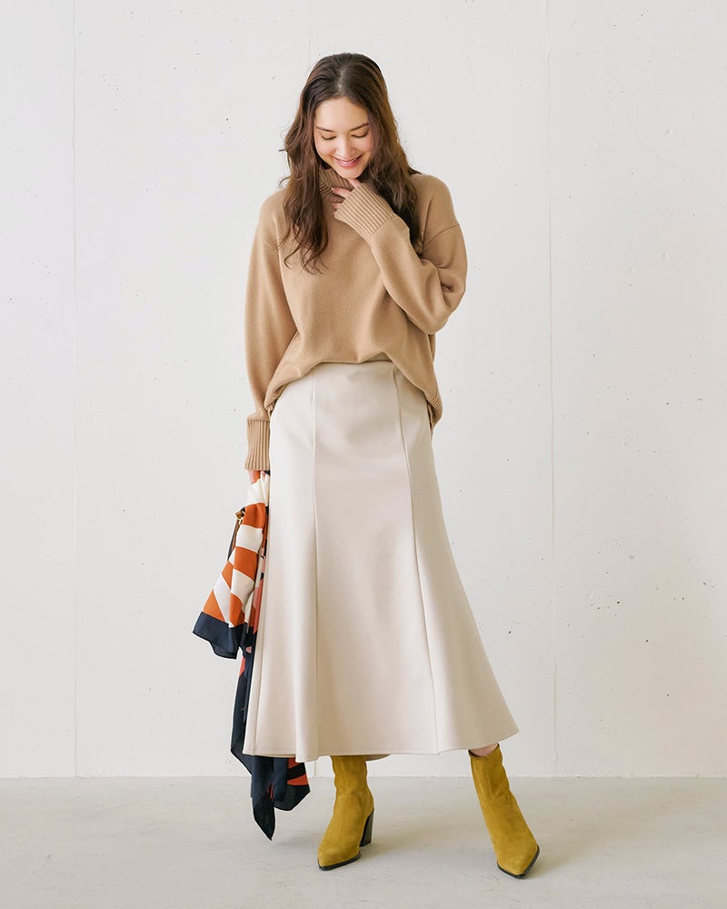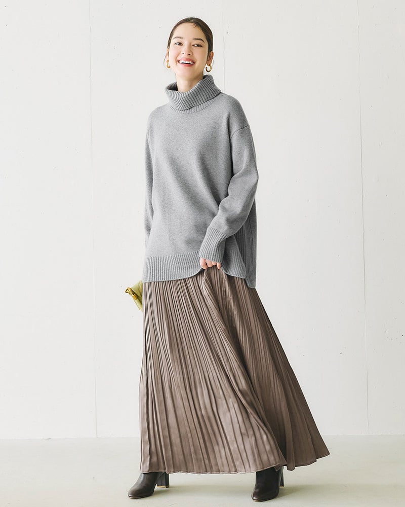 ゆったり着るだけで、今っぽい雰囲気になるロングニット。温かみのあるウール混素材でワイドなシルエットながら、首もとにゆとりのあるオフタートルやサイドリブなど、すっきり見える工夫をちりばめてお洒落に仕上げました。