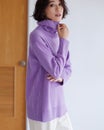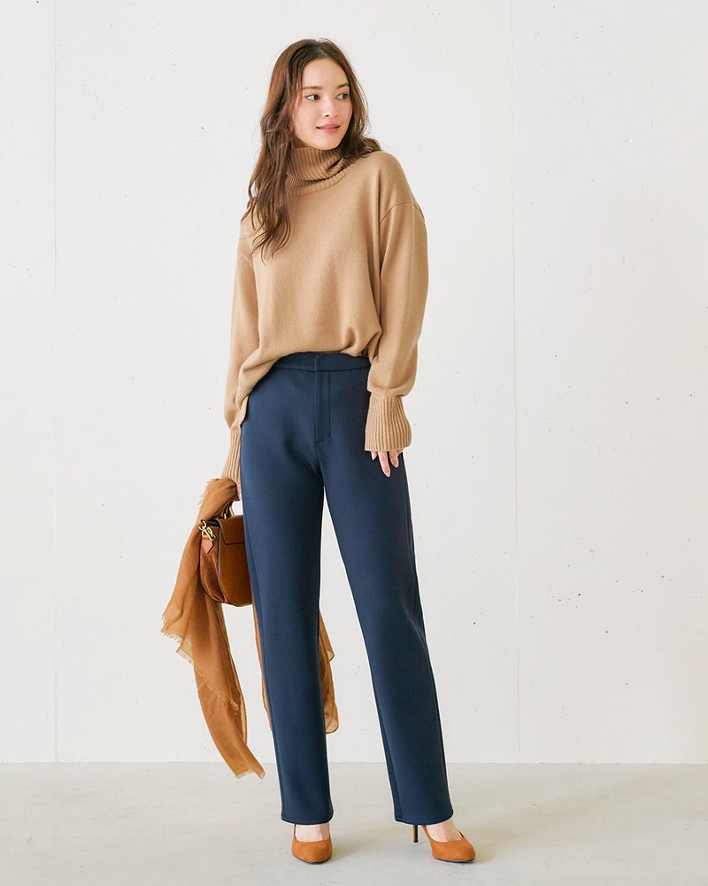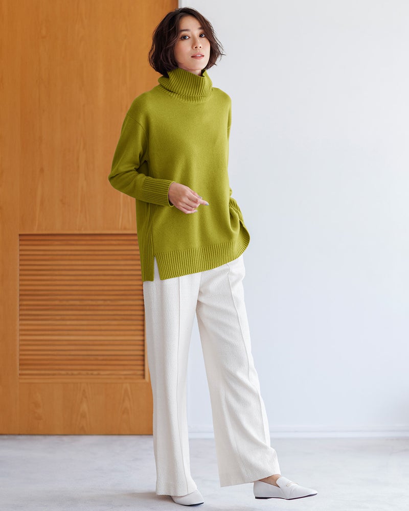 パンツと合わせて着ています。ピスタチオを購入しましたが、派手すぎず、合わせやすい色合いです。首元まで暖かくお気に入りになりそうです。
