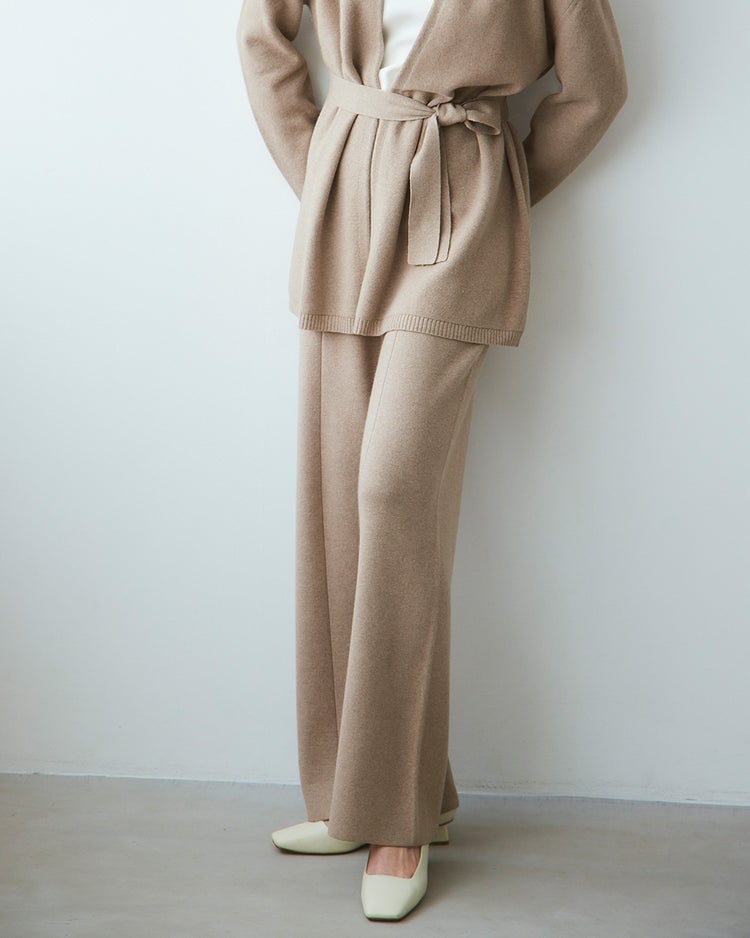 なめらかで暖かみのあるカシミヤ混ニット。ハリと伸縮性を両立したハーフミラノリブ編みの組織は、上品な表面感で体型を拾いにくいのが特長です。パンツは脚のラインが響かない控えめワイドシルエット。編み柄で脚長センターラインをデザインしました。同素材のジャケット(商品番号 31306)と合わせて、セットアップスタイルもお楽しみいただけます。
