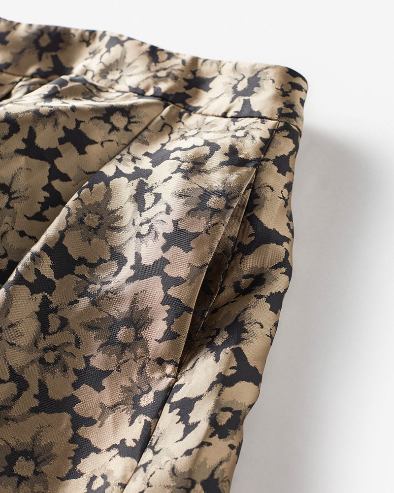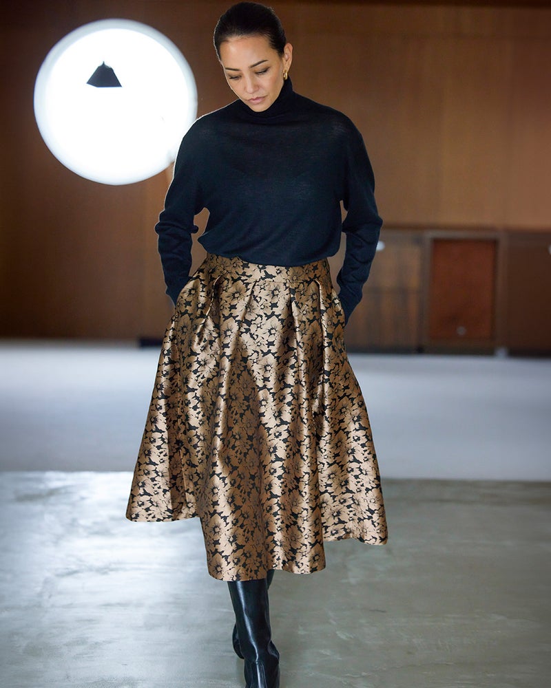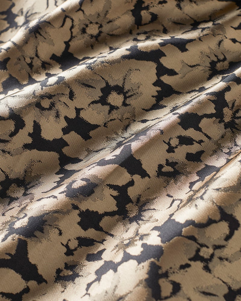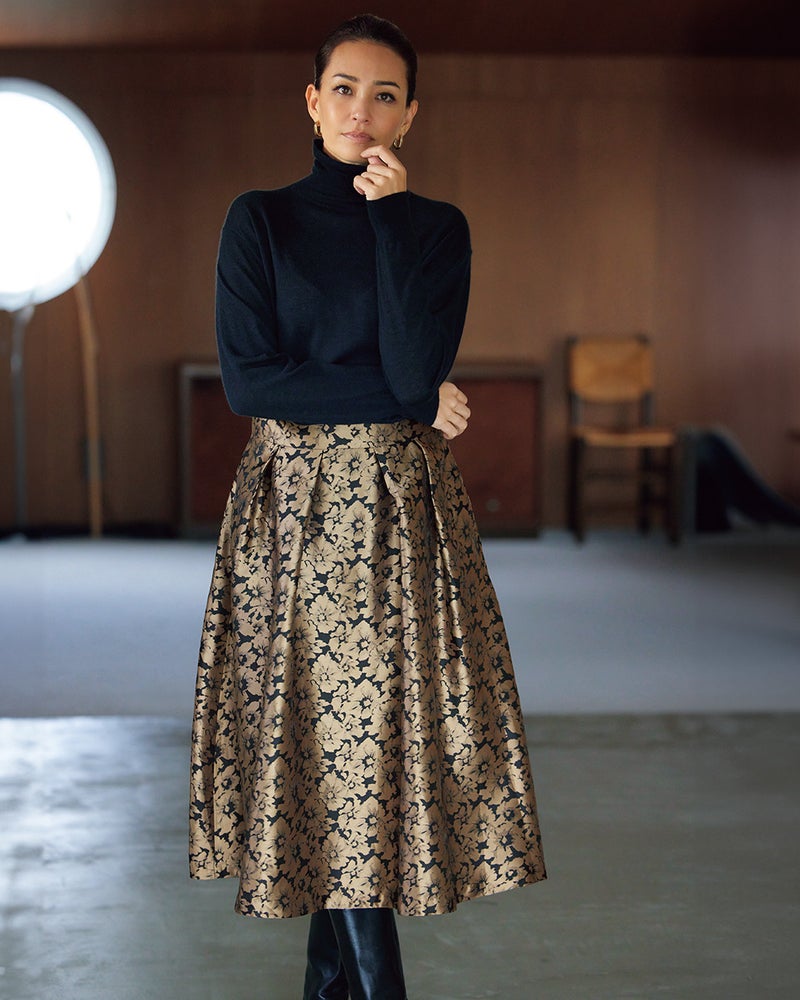 緻密に織られたジャカードが、艶やかな光沢を放つスカート