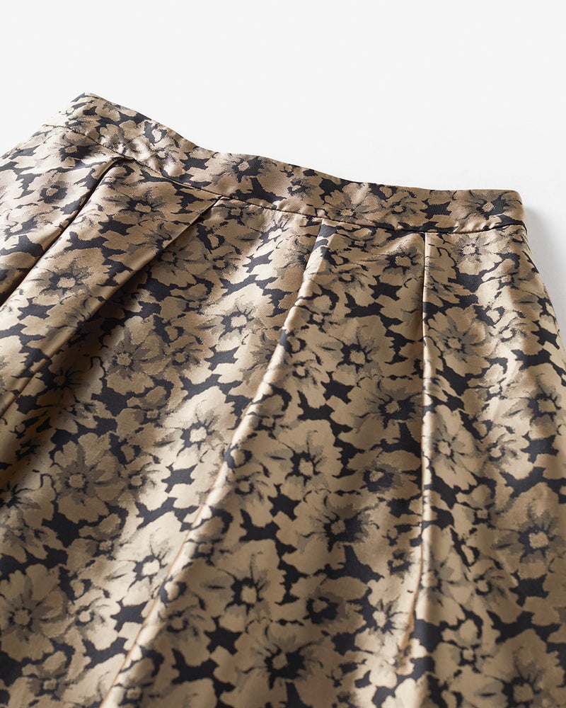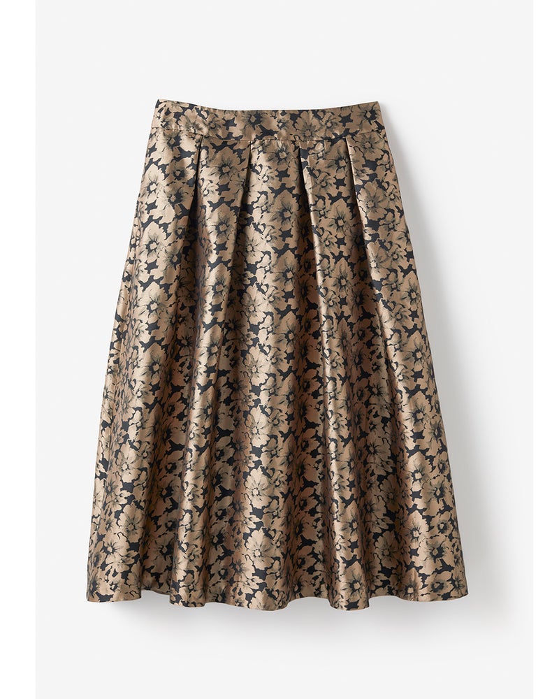 アンティークゴールドのようなシックな輝きが印象的な、装いの主役となるスカート。ジャカードで緻密に織られた生地はハリがあり、前後のタックからふわりと美しいフレアシルエットを描きます。
