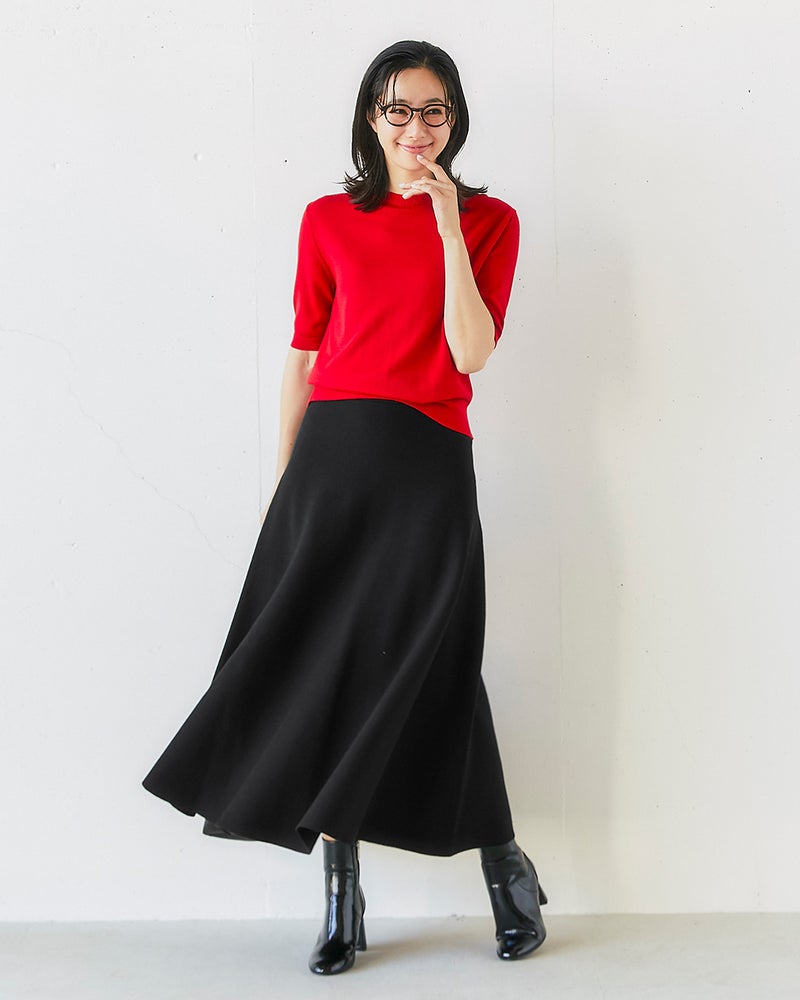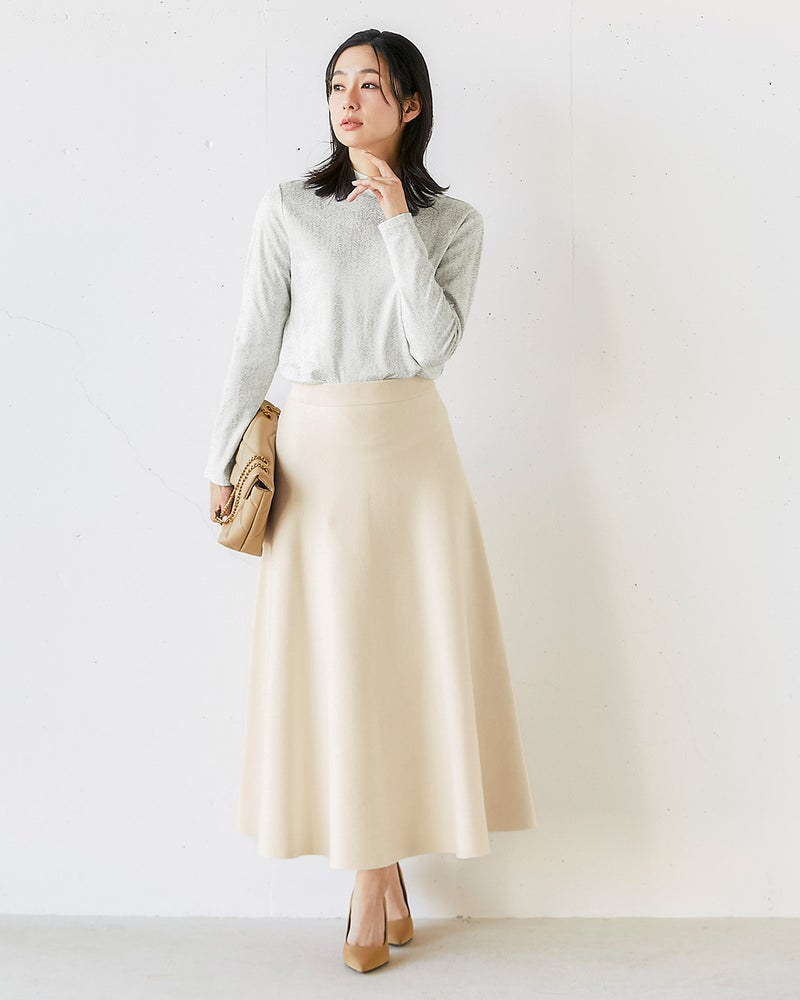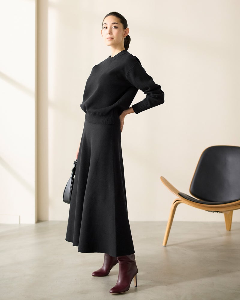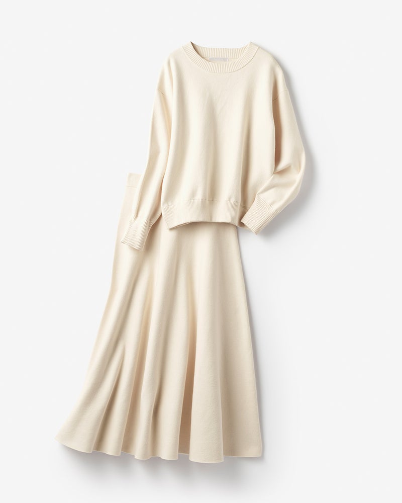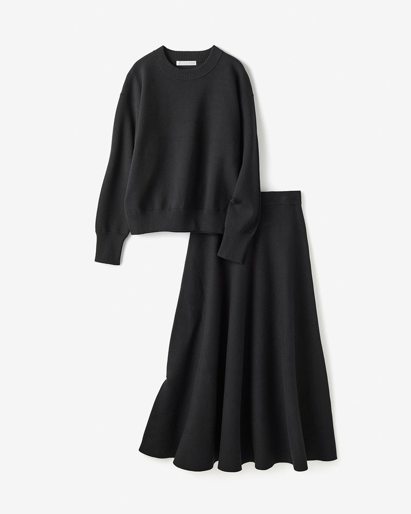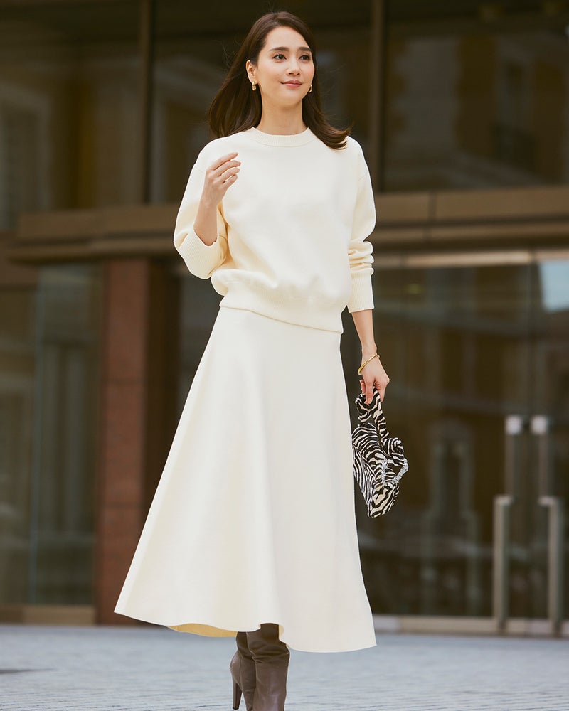 ボトムは美しいシルエットのフレアスカートをセットに。上下単品ずつでも着回しやすいデザインですが、上下セットで合わせることで、女性らしいスタイルと脚長バランスがパーフェクトに叶います。