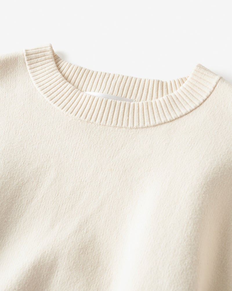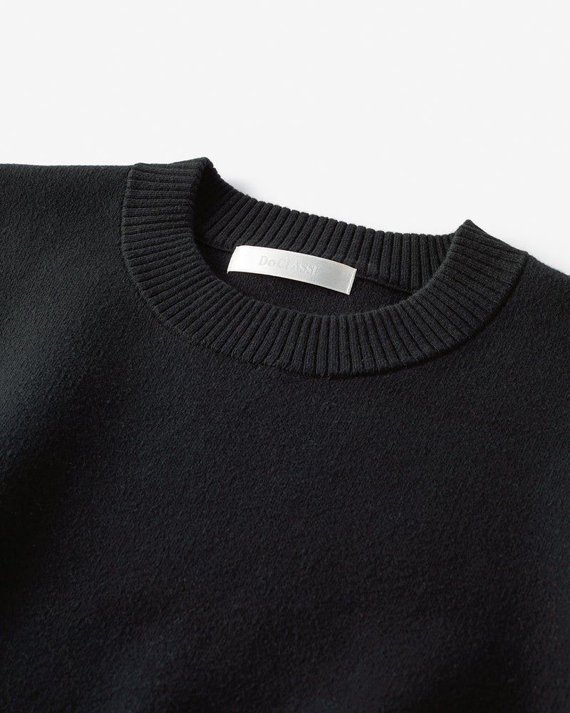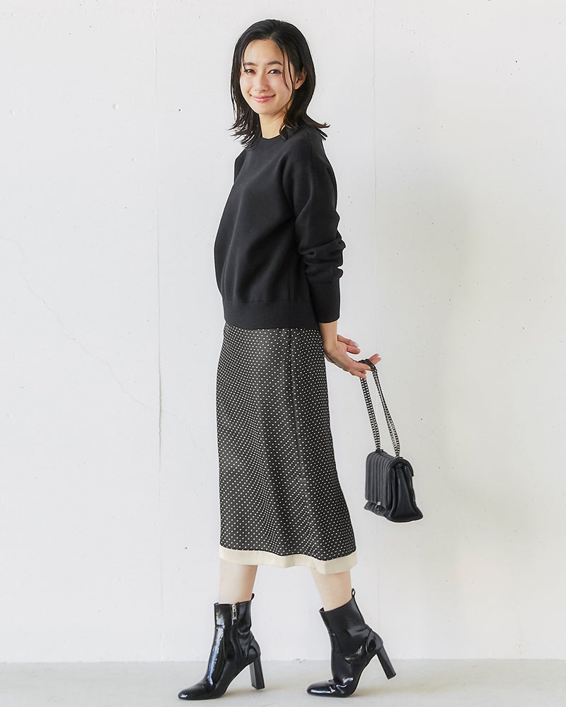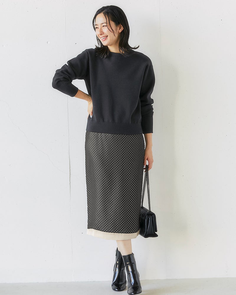 トップスは、詰まったネックラインに短め丈がカジュアルで今っぽいシンプルなプルオーバーニット。旬のスウェットに挑戦したいけれど、スウェットではラフになり過ぎるという方に、ぜひおすすめしたいデザインです。