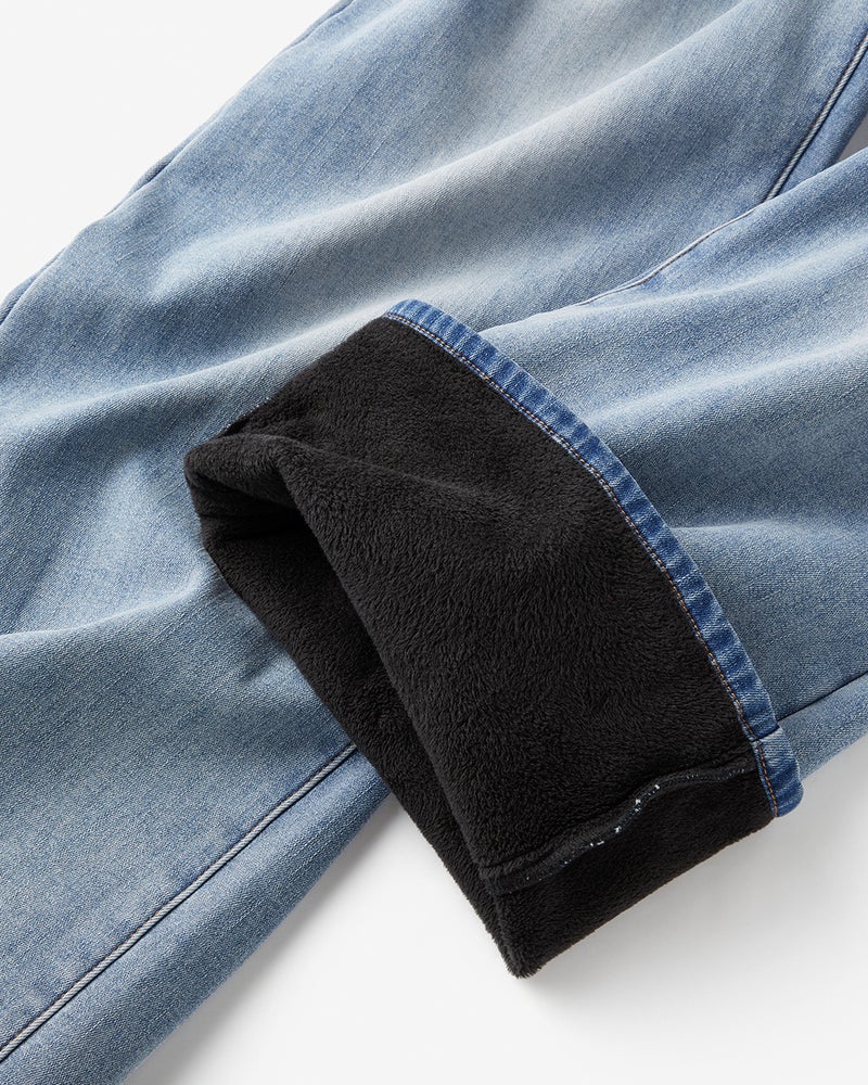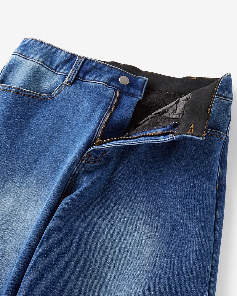 寒さの厳しい季節もポカポカのはき心地が続くニットデニム。毛足の長いベロア素材を、足もとからヒップまわりまで裏側全面にあしらいました。ゴワゴワしない柔らかな質感で、ストレッチ性もばっちり。デニムの色落ち感を忠実に再現した、美しい仕上がりも魅力です。