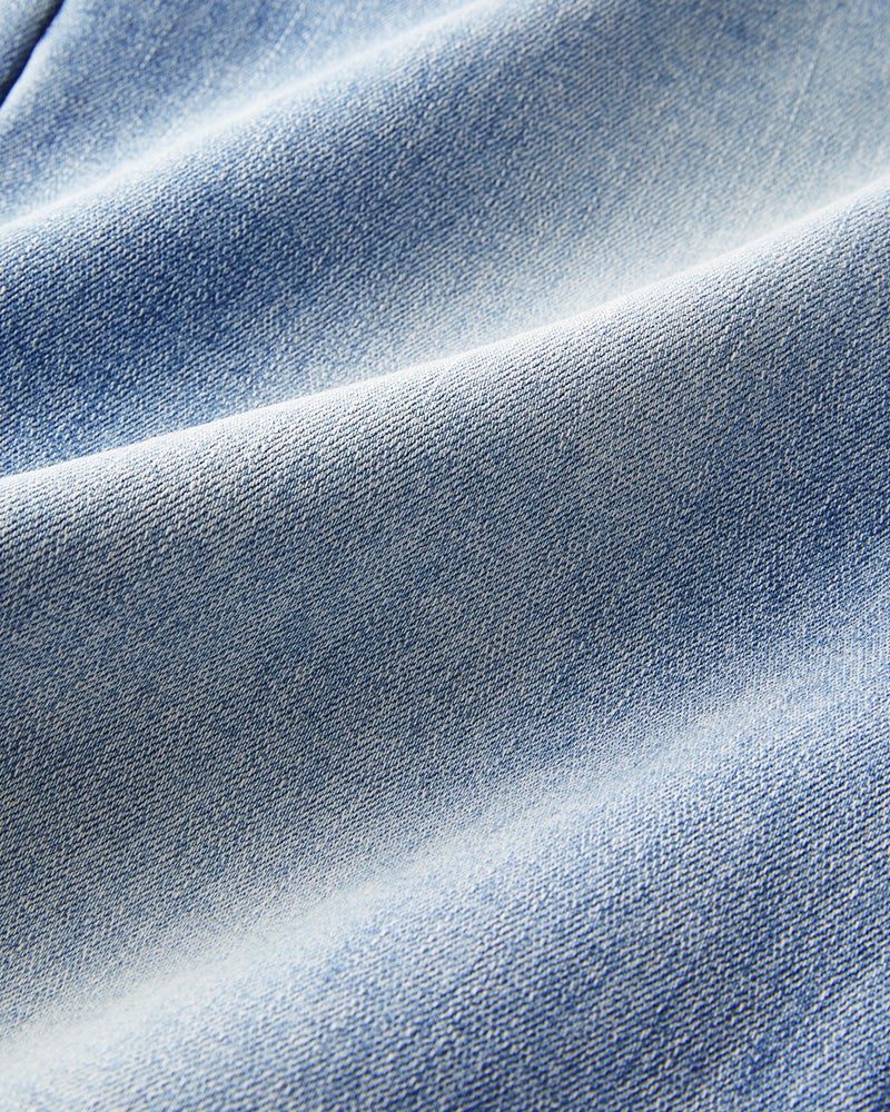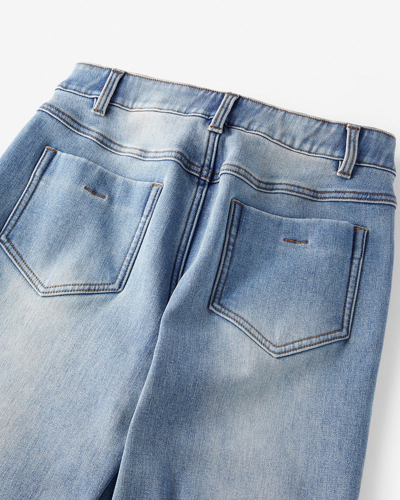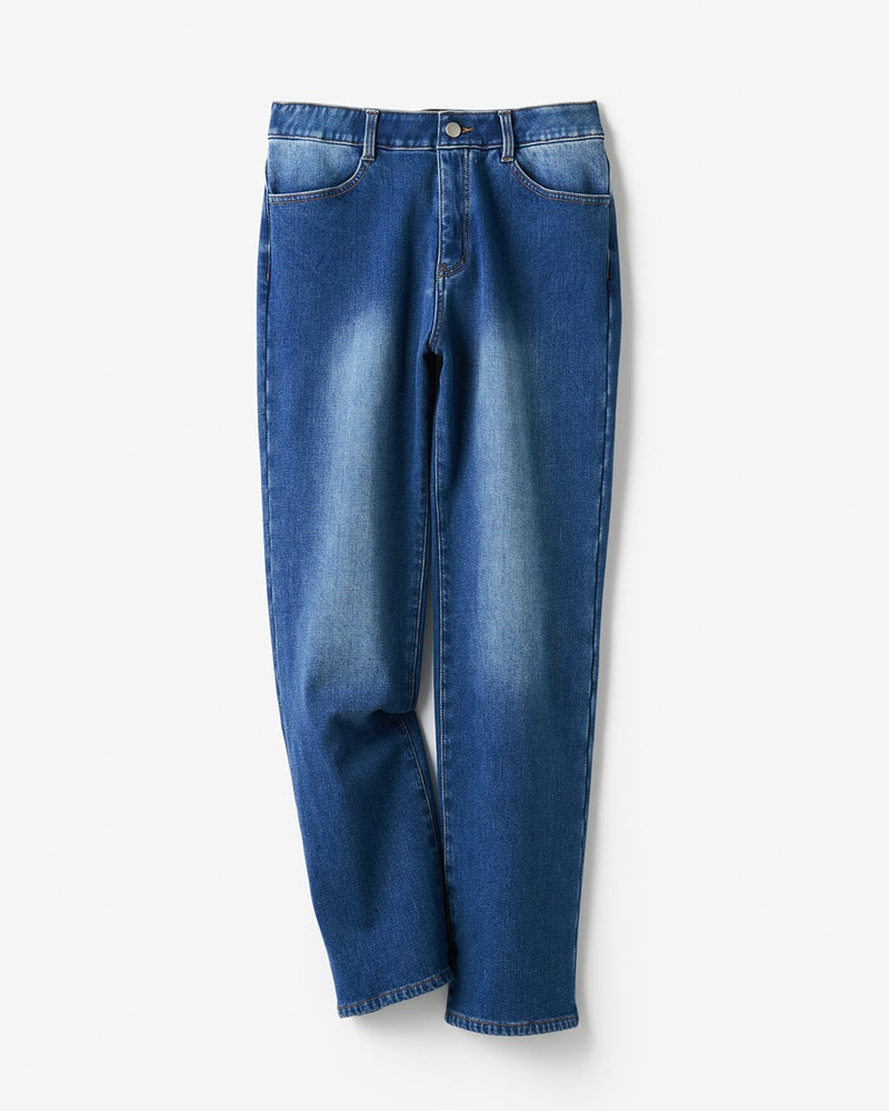 伸縮性の高いカットソー素材ながら、まるでリアルデニムのような色落ち感を繊細に表現。はき心地のラクさとデニムの雰囲気の、いいとこどりを叶えました。