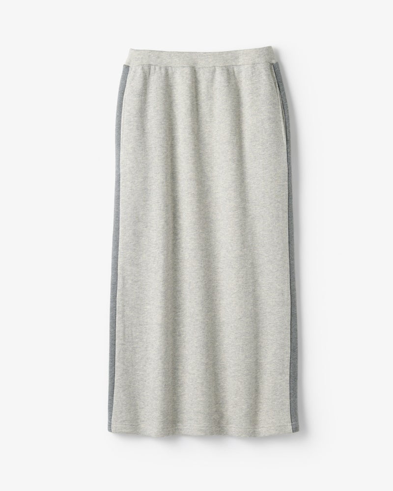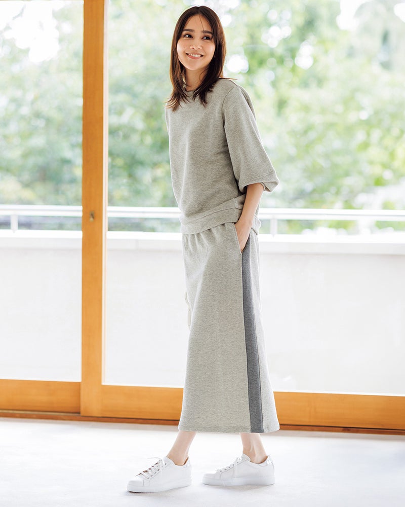 サイドラインがすっきりとメリハリを両立サイドにカットソー生地で配色ラインを入れたナロースカート。しなやかなスウェット素材だから、ほっそりシルエットでも足さばきはスムーズ。同素材のプルオーバー(商品番号 31381)と合わせて、セットアップとしてもお楽しみいただけます。