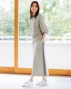 色も明るいグレーで、この時季はダーク色の服が多いので、いい感じに合わせやすいです。両サイドのラインで下半身が引き締まって見えます???? 暖かい素材です。