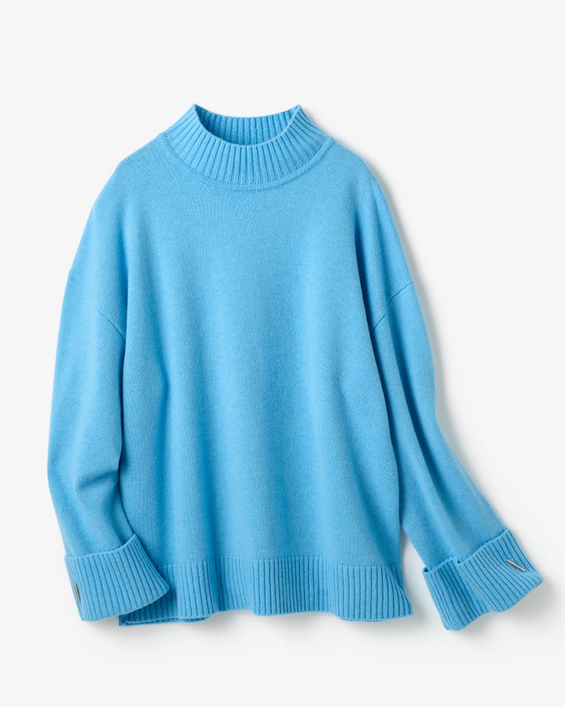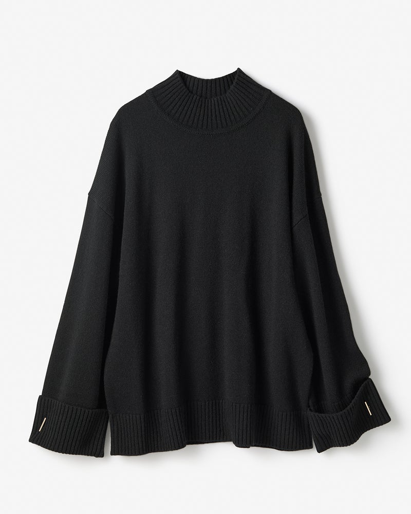 袖口は幅広のリブ素材を折り返したカフス風デザイン。シルバーパーツをカフスボタンのようにあしらって、ニットに品をプラスしました。