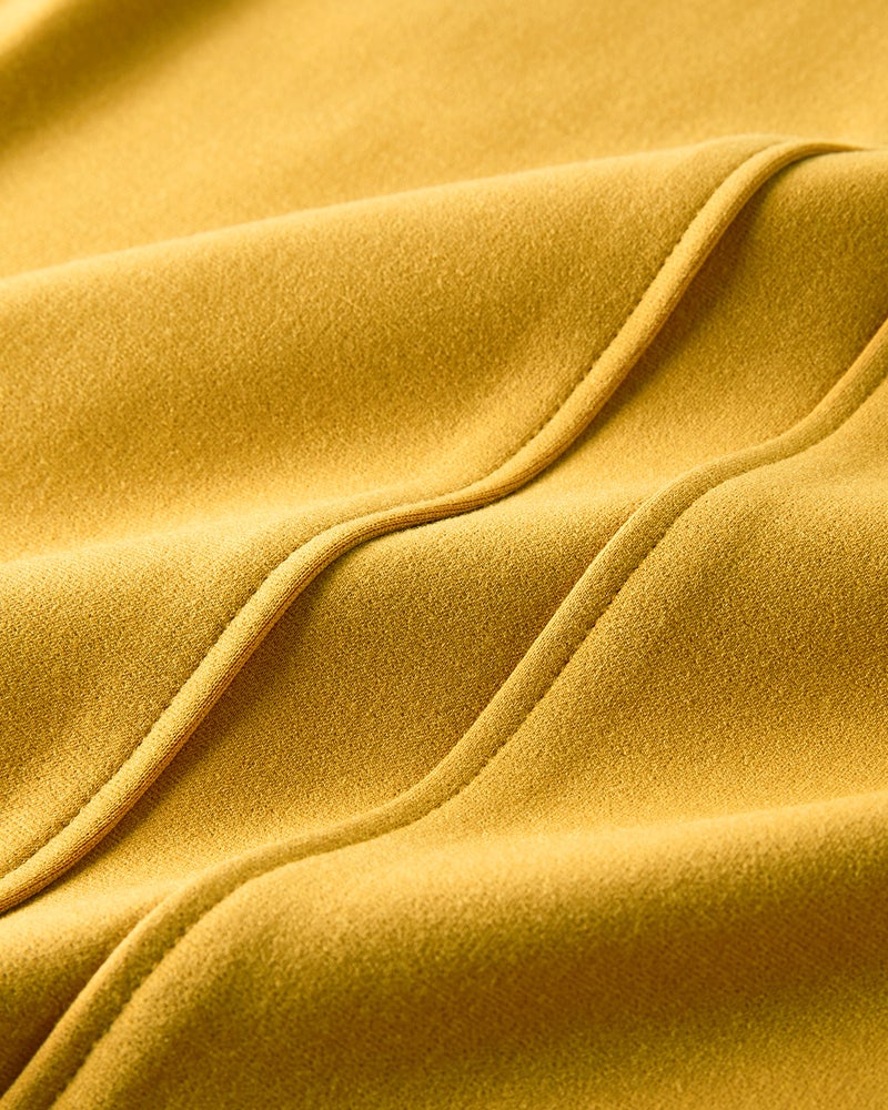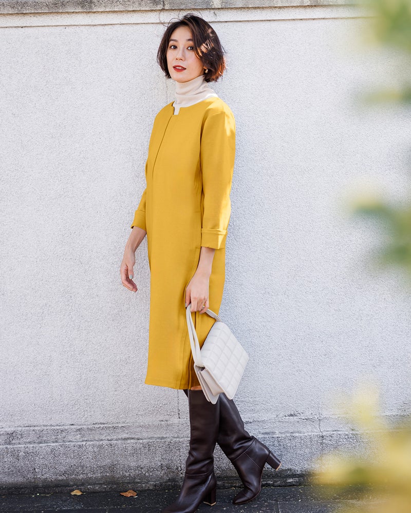 違和感なく身体の線を拾わず着れます。マスタードを選択しましたが、派手過ぎずオフィスワークにも調和します。別のカラーも検討中です。