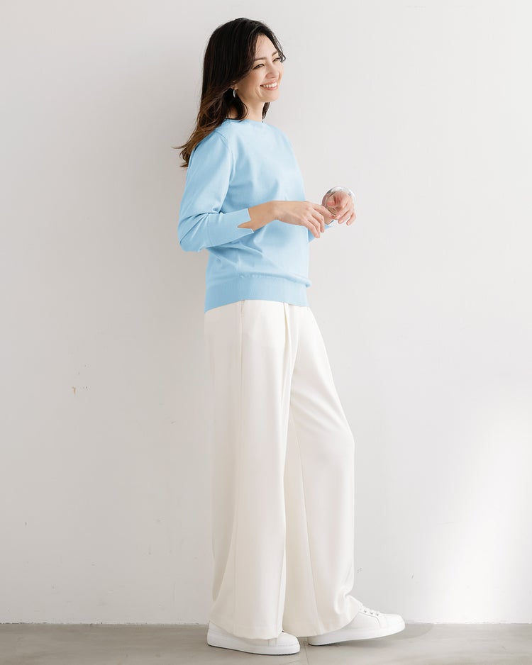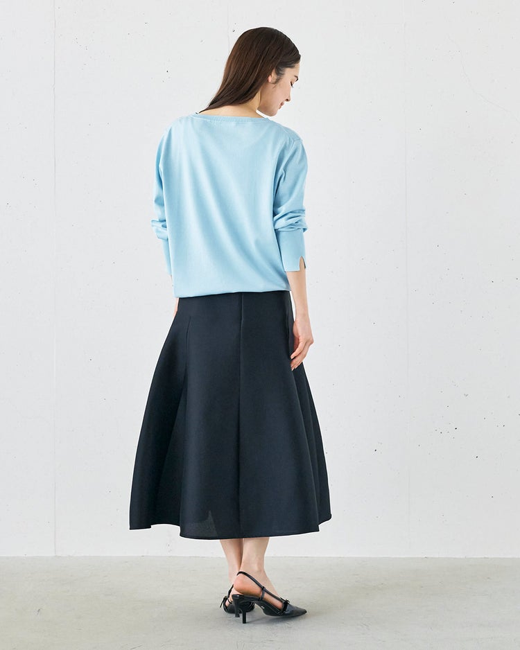 素肌にさらっと着られるなめらかなハイゲージニット。抜け感がありながらも肌の露出を抑えたボートネックデザインで、カットソーよりも上品見えしながらもストレスフリーな着心地は、毎日つい手に取りたくなる心地良さです。