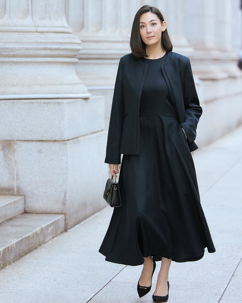 お仕事や行事ごと、少しきちんと装いたい時やお仕事の大事なシーンなど、セレモニー以外でも何かと活躍の機会が多いきちんとスタイル。上品だけどお洒落心もあって、ラクな着心地とお手入れの簡単さも欲しい…。そんな大人の理想を叶えたのがこの「スマートツイル」シリーズ。かっちりしすぎず、さりげなく女らしい。そんなスタイルにぴったりなのが、ダブル衿仕立てのペプラムノーカラージャケット。ウエストラインから自然に広がるペプラムシルエットは、ワンピースやスカートにも好相性です。