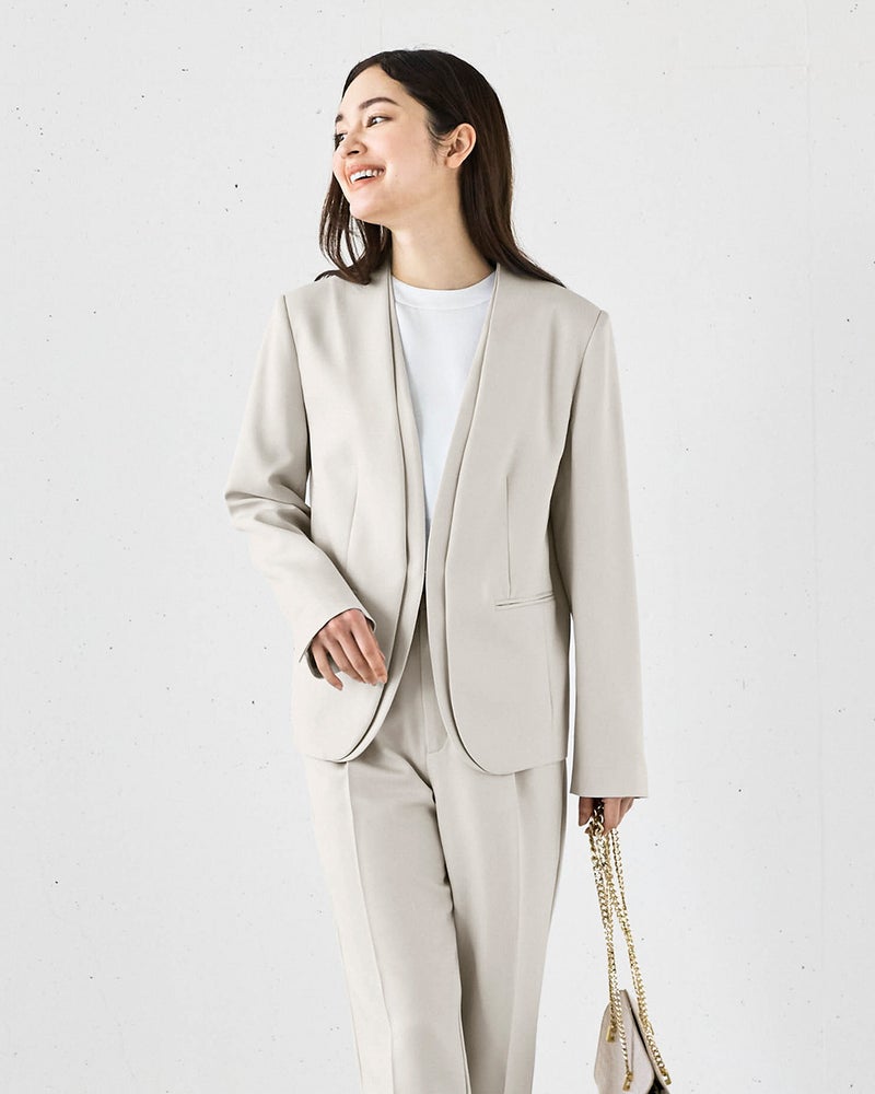 Vネックのノーカラージャケットは、凛としながらも堅苦しくなく、女性らしさを引き立てるスタイル。V開きを二重にしたダブルフロント仕立てだから、ノーカラーでもシンプルになりすぎません。