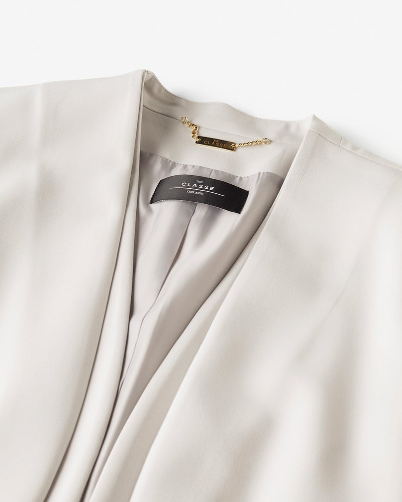 ウエストの曲線ラインを美しく魅せるすっきりとしたシルエットですが、しなやかな素材のおかげでストレスフリーな着心地に。背面は、腰から自然に広がるペプラムシルエットで、横姿まで美しく。フロントにはホックを備え、前を開けて羽織ってもシックにキマるデザインに仕上げました。