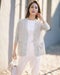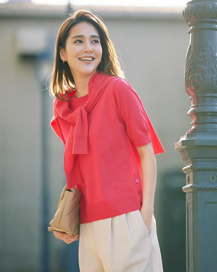 柔らかな着心地できちんと感も演出できるニットカーディガンは、お仕事スタイルの強い味方。前立て、ポケット口に艶のあるグログランテープをあしらったデザインなら、シンプルなだけじゃないほんのりエレガントなスタイルに。同素材のハーフスリーブトップス(商品番号 31537 コットン混・グログラン使いトップス)と合わせたアンサンブルの着こなしもおすすめです。