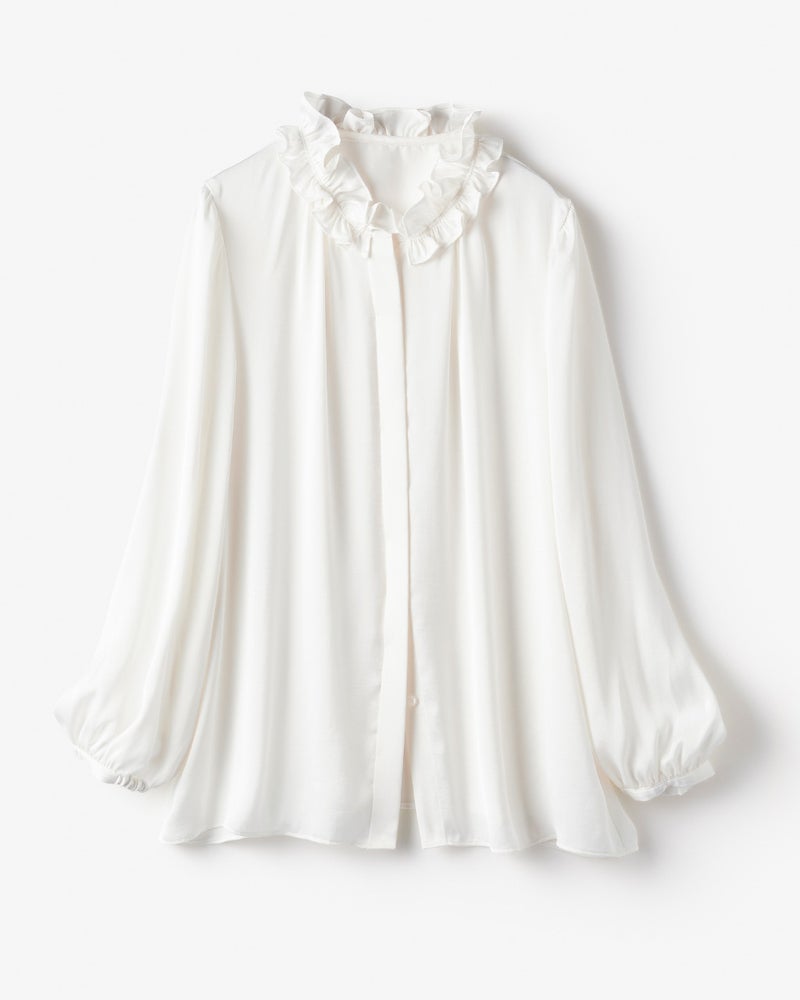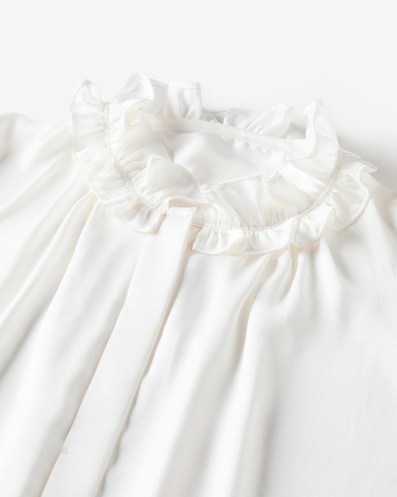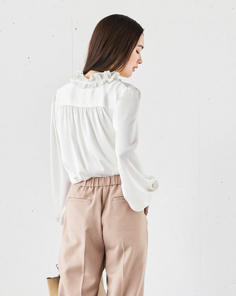 ニュアンスサテンのフリル衿ブラウス