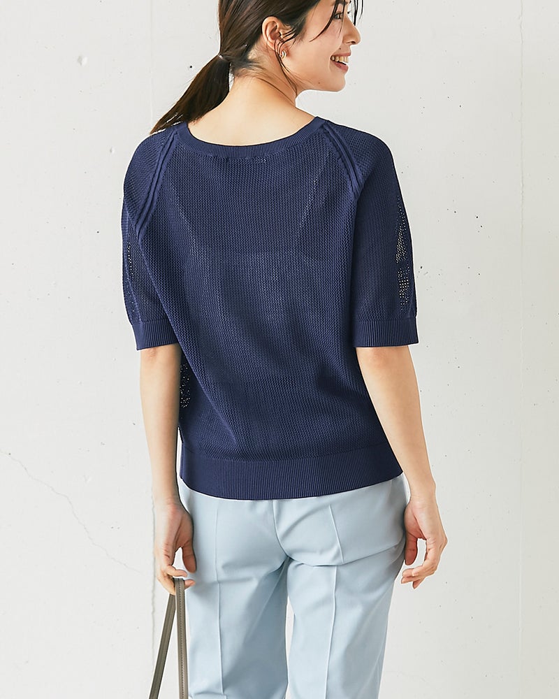 - メッシュだとカジュアルになりすぎることもありますが、インナーが透けることもなく、きれいめに着られます。サイズはいつものサイズで体のラインを拾わない感じです。これからの季節に長く着られるニットだと思います。