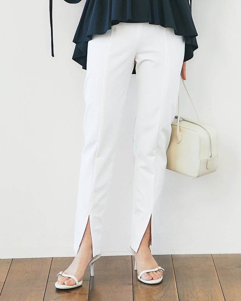 オーバーサイズのトップスやワンピースとのレイヤードなどモードなコーデにも高相性のストレッチスリム。前裾に入れたスリットの効果で、驚くほど脚が細く、長く!素材は動きやすい伸縮性と身体の線を拾わないハリを兼ね備えたポンチ素材。ウエストゴムでスムーズにはいていただけます。2丈からお選びいただけます。