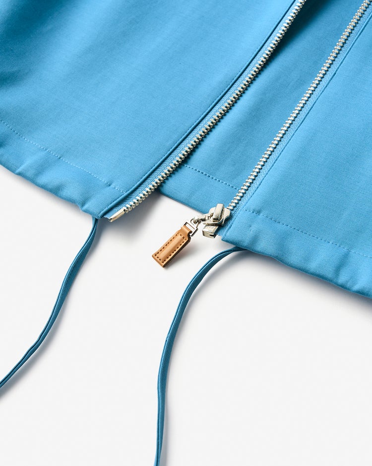 - 裾にはドローコードを通してフォルムチェンジも楽しめる仕様に。ファスナーのスライダーにはエコレザーを使い、アクセントをプラスしました。袖の筒幅はゆったりと。袖口のベルトが手もとをシャープに彩ります。
