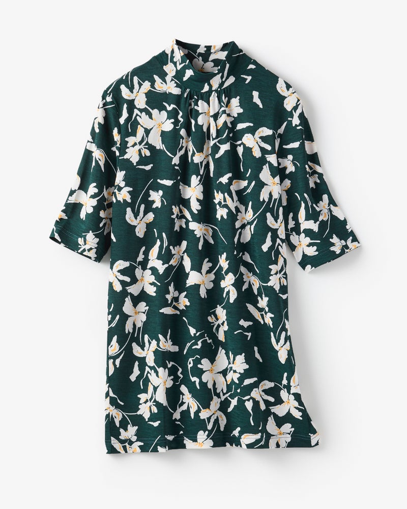 ギャザーハイネックで首元のカバーができて、サラリとした着心地で一枚で着ても合わせやすいので、五部袖・七分袖とお気に入りで柄を変えて購入。