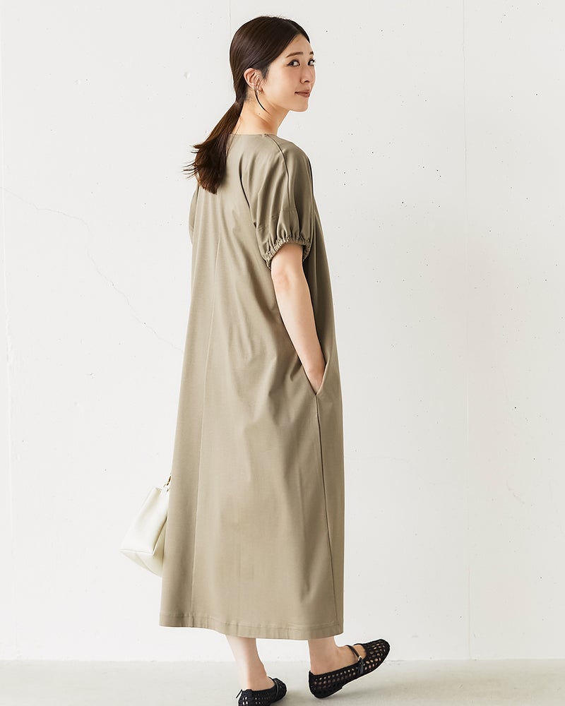 すぽんと着るだけでお洒落が完成する、なめらかなスムースカットソー素材を使ったワンピース。リラクシーなシルエットで、袖口にギャザーを寄せたボリュームスリーブやVネック、センターの切り替えラインが、全身を華奢に見せてくれます。