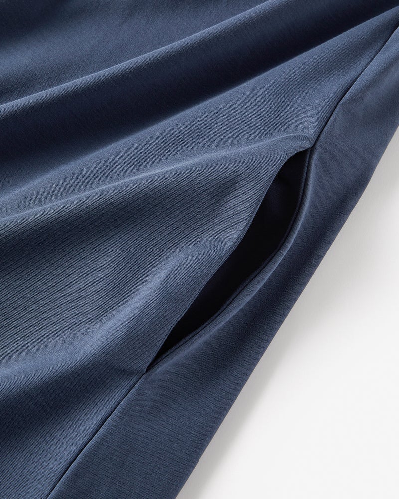 - 落ち着いたブルー、綺麗な色で気に入りました。胸のVの開き具合もちょうど良く素敵なワンピースです。ゆったりとした作りでしたのでもうワンサイド下のMでも良かったかも…。