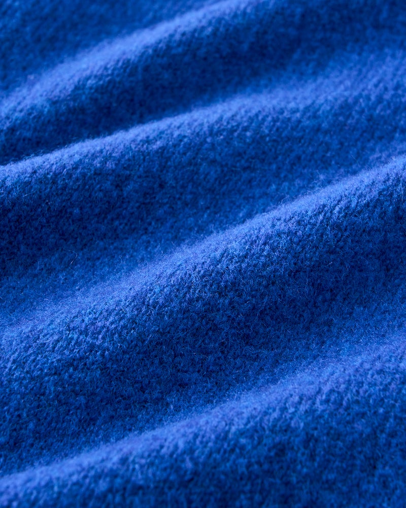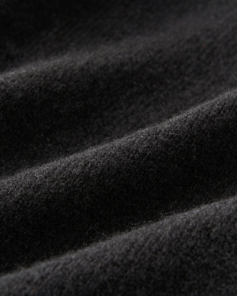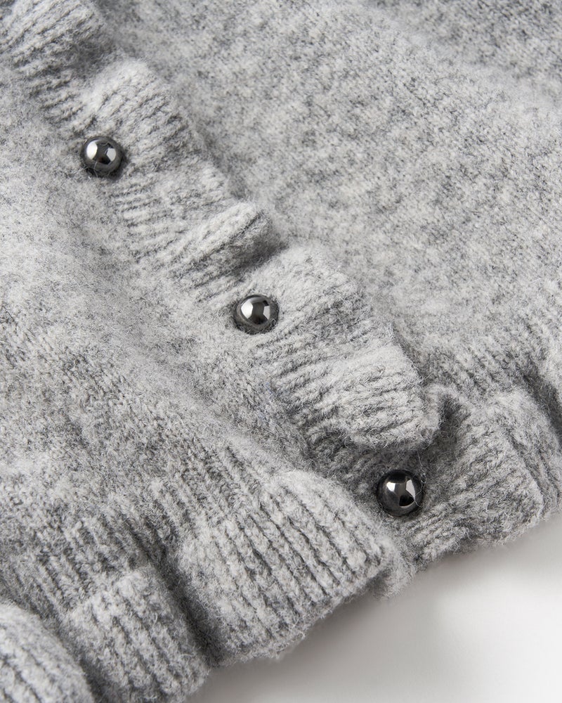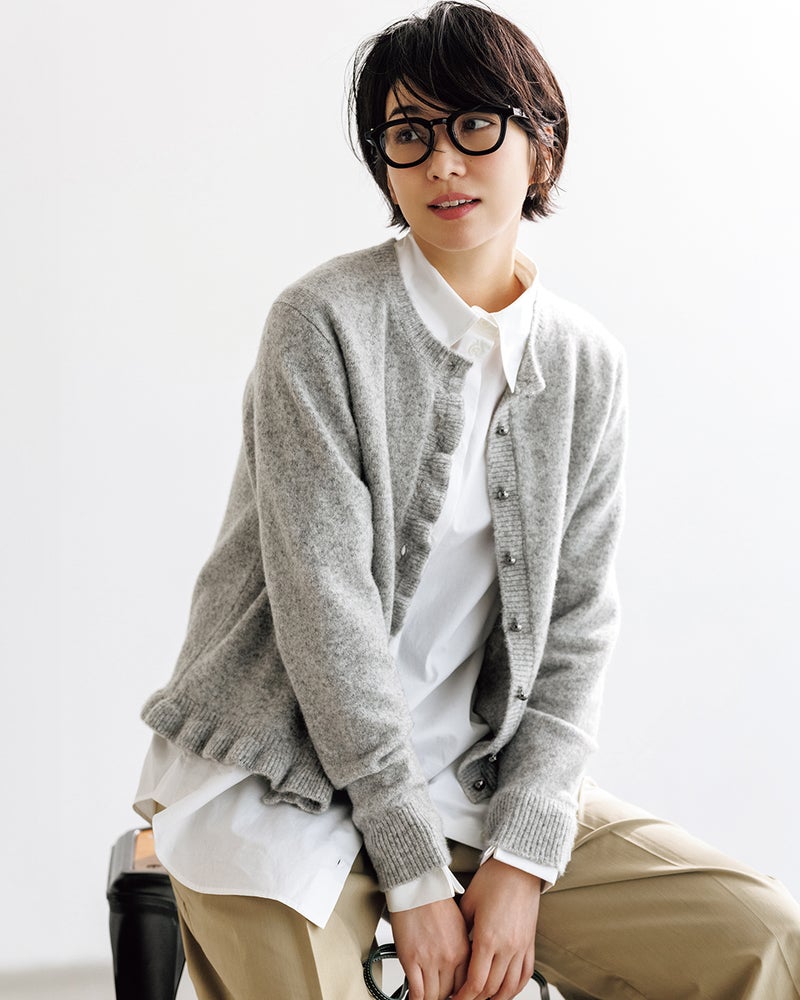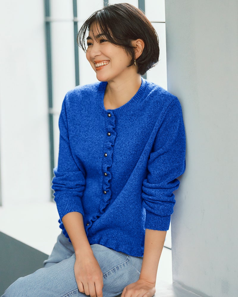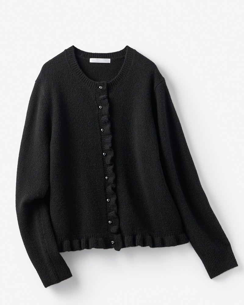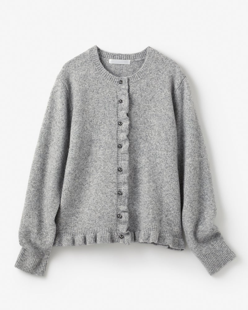 もっちりと弾力のあるウール混タム素材で編み立てたクルーネックカーディガン。前立てと裾のリブを片畦編みに切り替えてフリルを作った立体的なデザインが光ります。ベーシックなカーディガンコーデに変化をつけたい方におすすめ。