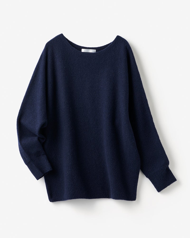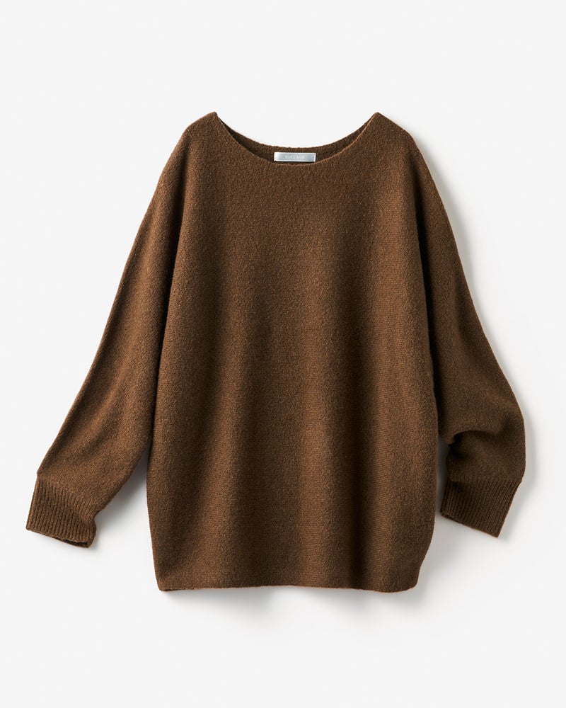 開きが広すぎず、首すじや顔まわりをすっきりきれいに見せるボートネック。素肌に着てちくちくせず心地よい、もちふわニットの質感を堪能できる1枚です。ゆったりしたドルマンスリーブで、抜け感のあるシルエットに。