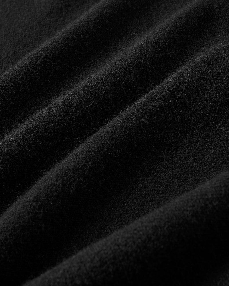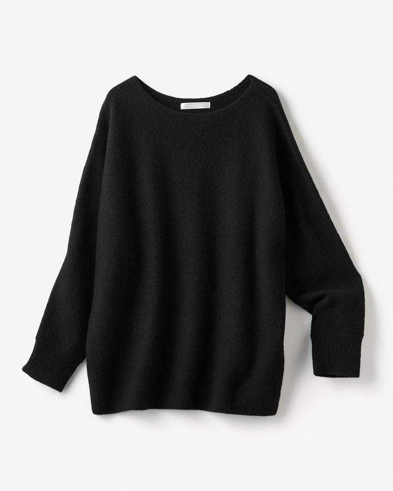 - 衿開きが広すぎない、女らしいボートネック天竺編みの横地使いで、耳の部分を使うため切り替えがなく、すっきりとしたボートネックに仕上げました。編み続きのドルマン袖で、さらにフェミニンな印象に。