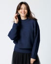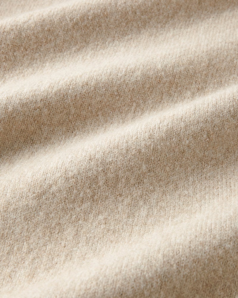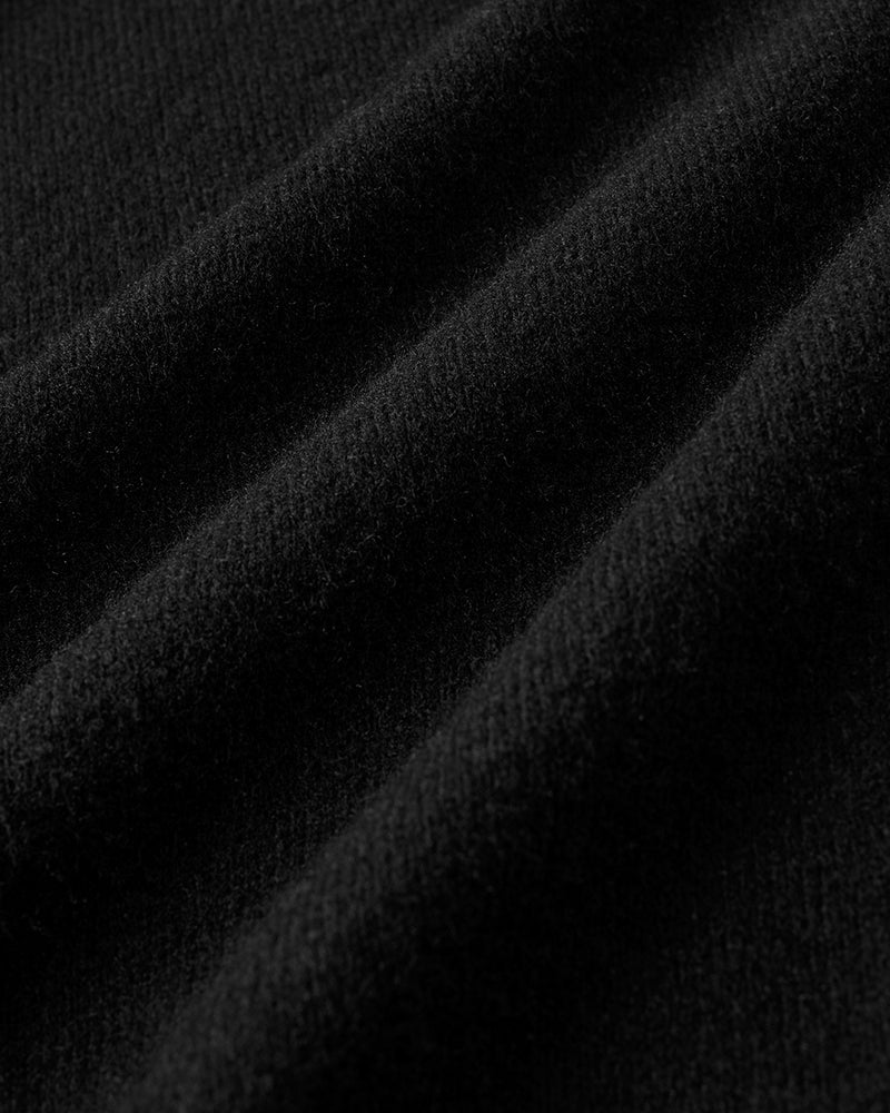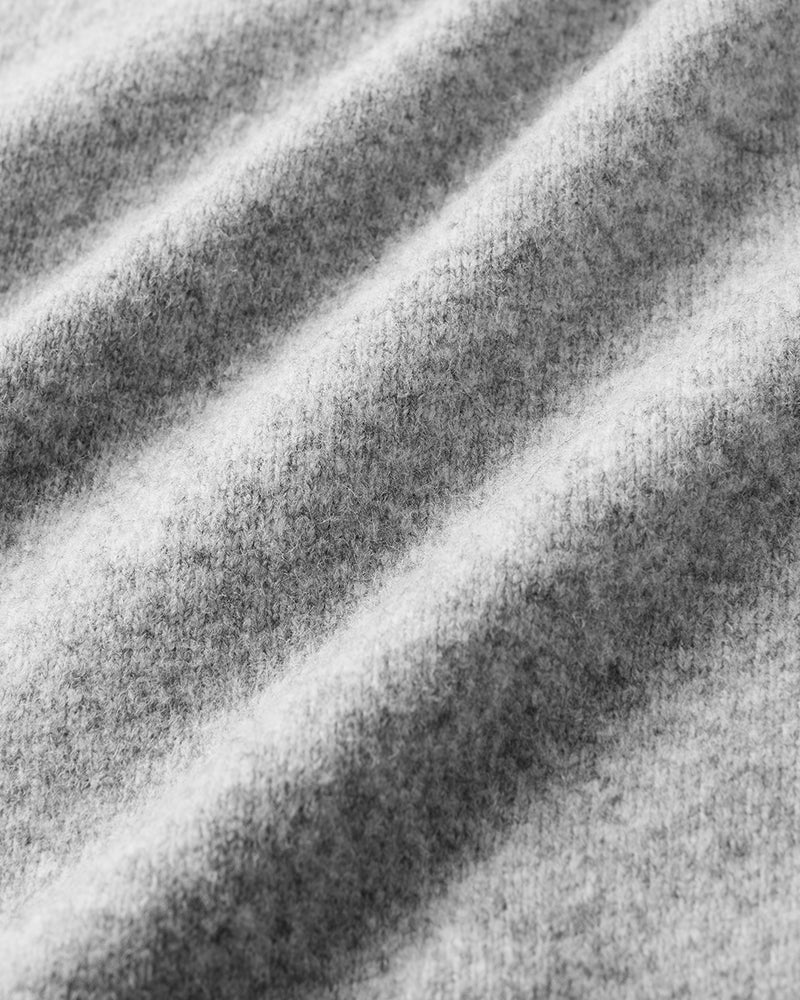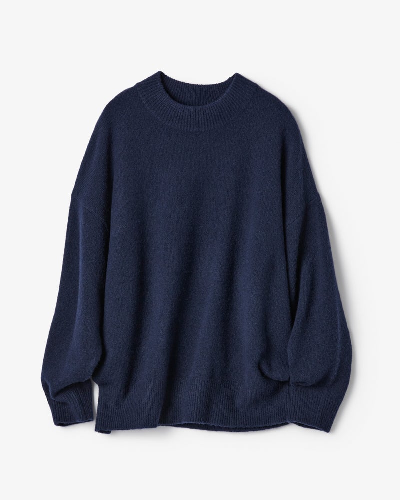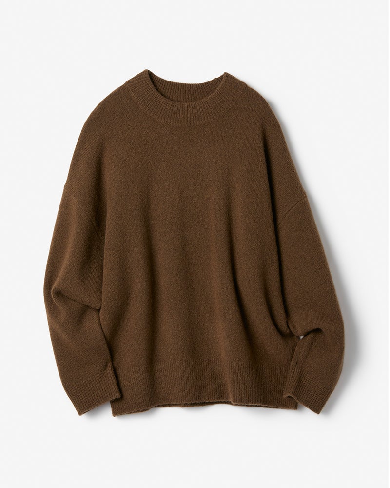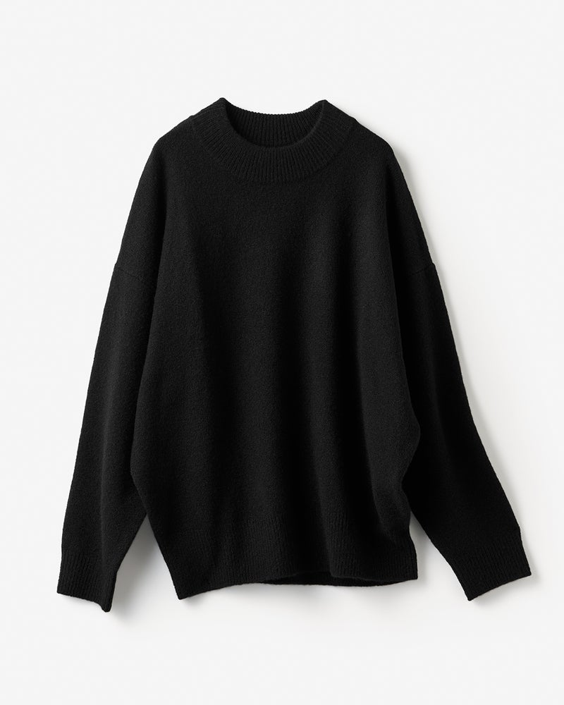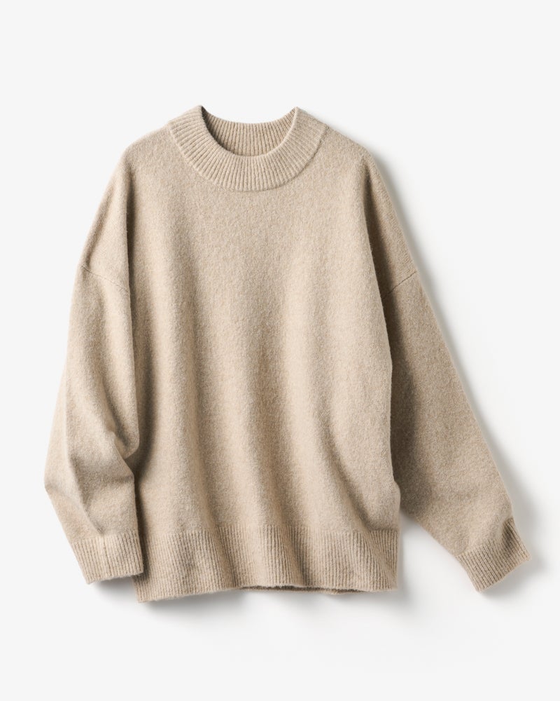 4.5㎝のハイネックは、首が詰まりすぎずクルーネックに近い着こなしやすさ。肩の位置が少し落ちているので、ほどよく力の抜けた印象に。