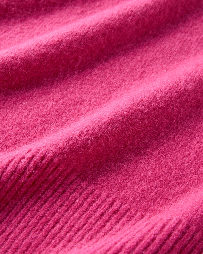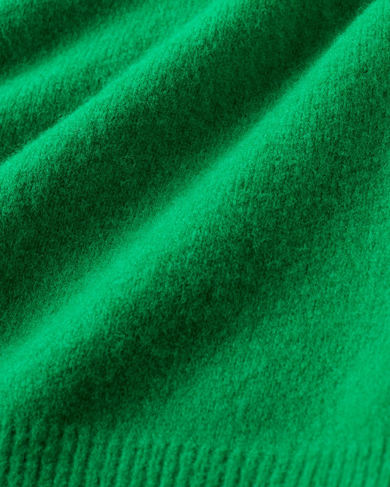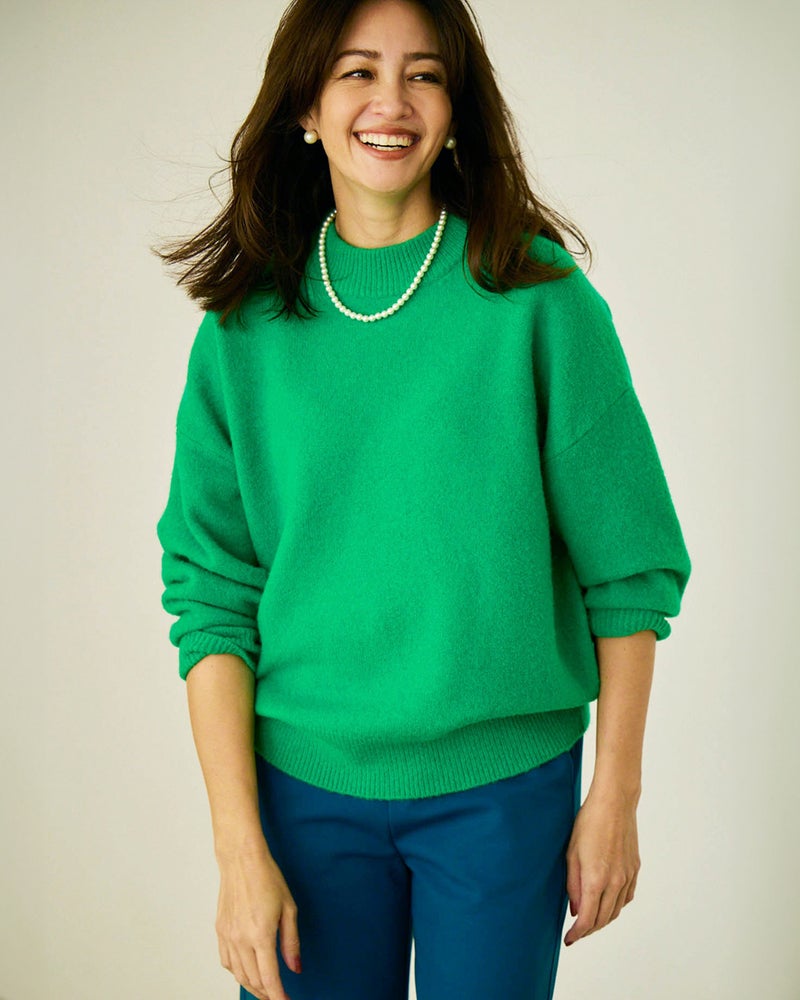 - 絶妙丈のハイネック。ドロップショルダーが抜け感をつくる。4.5㎝のハイネックは、首が詰まりすぎずクルーネックに近い着こなしやすさ。肩の位置が少し落ちているので、ほどよく力の抜けた印象に。