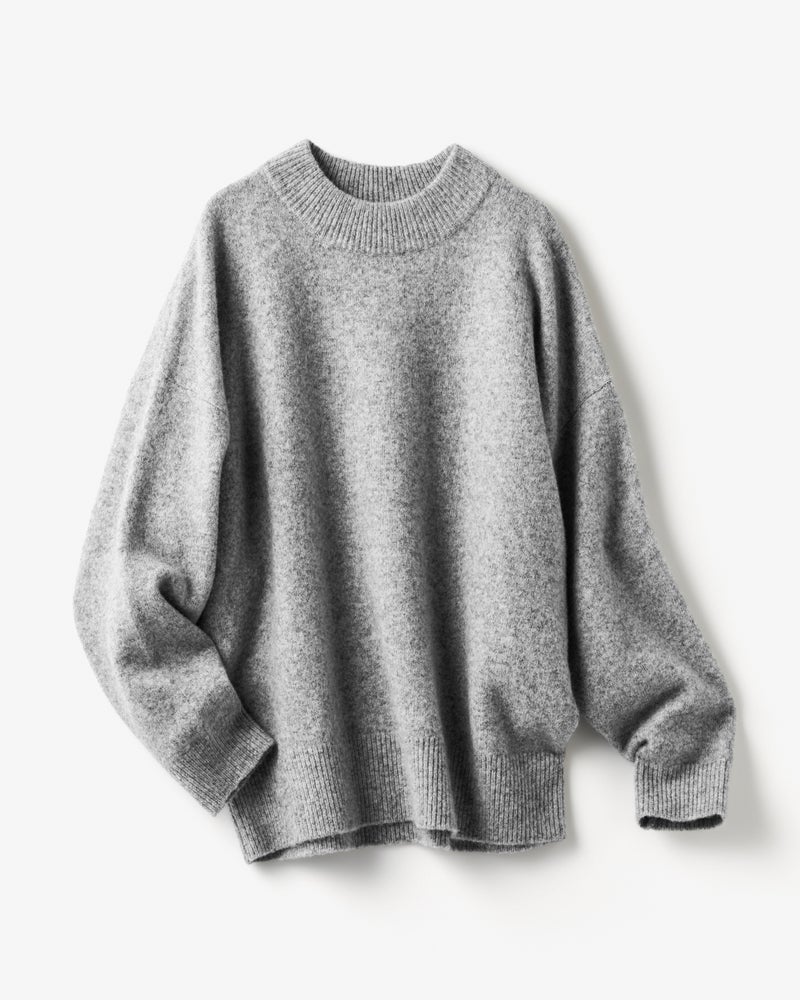 4.5㎝のハイネックは、首が詰まりすぎずクルーネックに近い着こなしやすさ。肩の位置が少し落ちているので、ほどよく力の抜けた印象に。