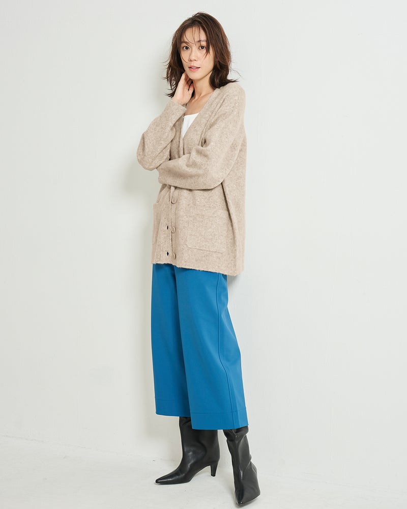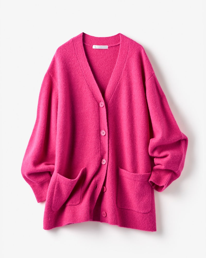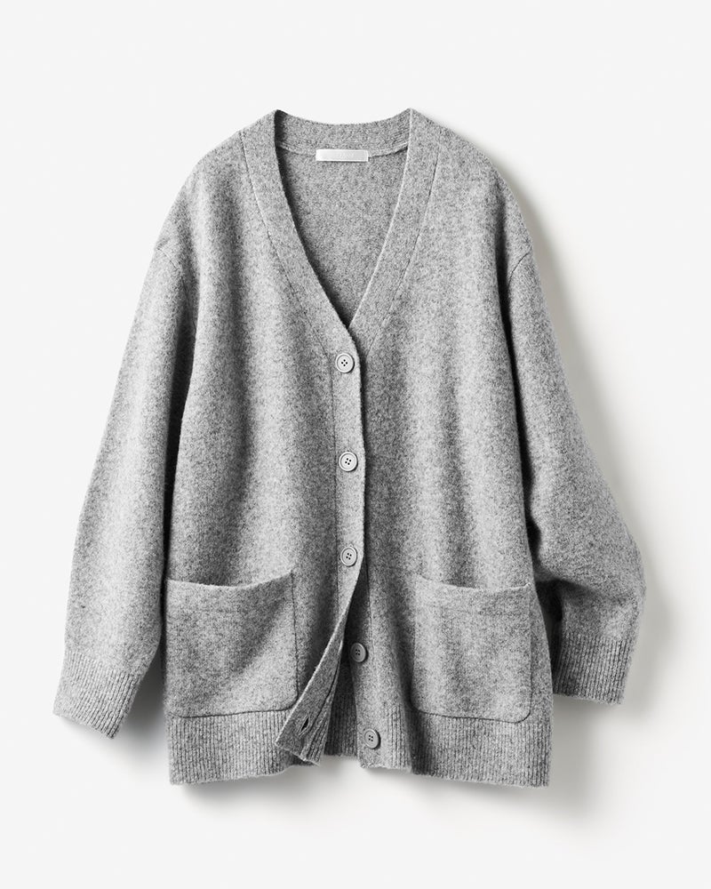 旬のゆったりボックスシルエットのカーディガン。ほどよく長めの着丈だから、暖かい日はざっくり羽織ってアウター代わりに。前ボタンをとめるとVネックセーターの感覚で着られ、コートの下に着てももたつきません。フロントの大きめポケットもチャーミング。