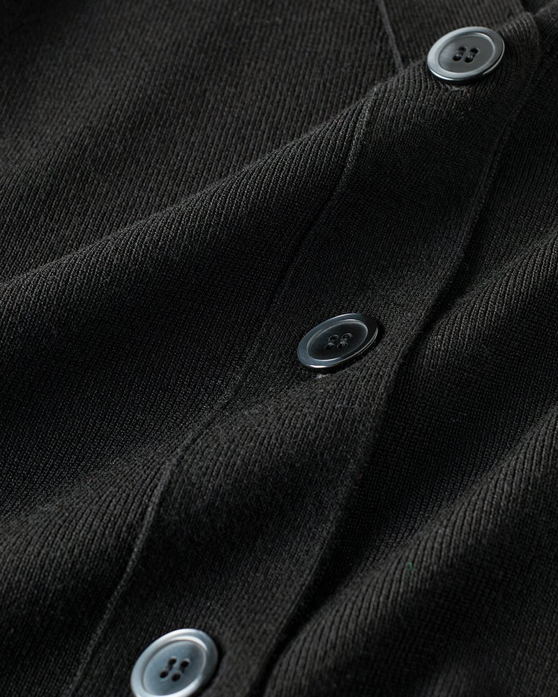 - 昨年重宝した総針編み・Vネックボタンカーディガンの今年版。3シーズン着られる便利なカーディガンです。説明にあるように、たしかに横のスリットがあるので、ワイドパンツにも合うようになっています。紺がありませんが、強く希望します。