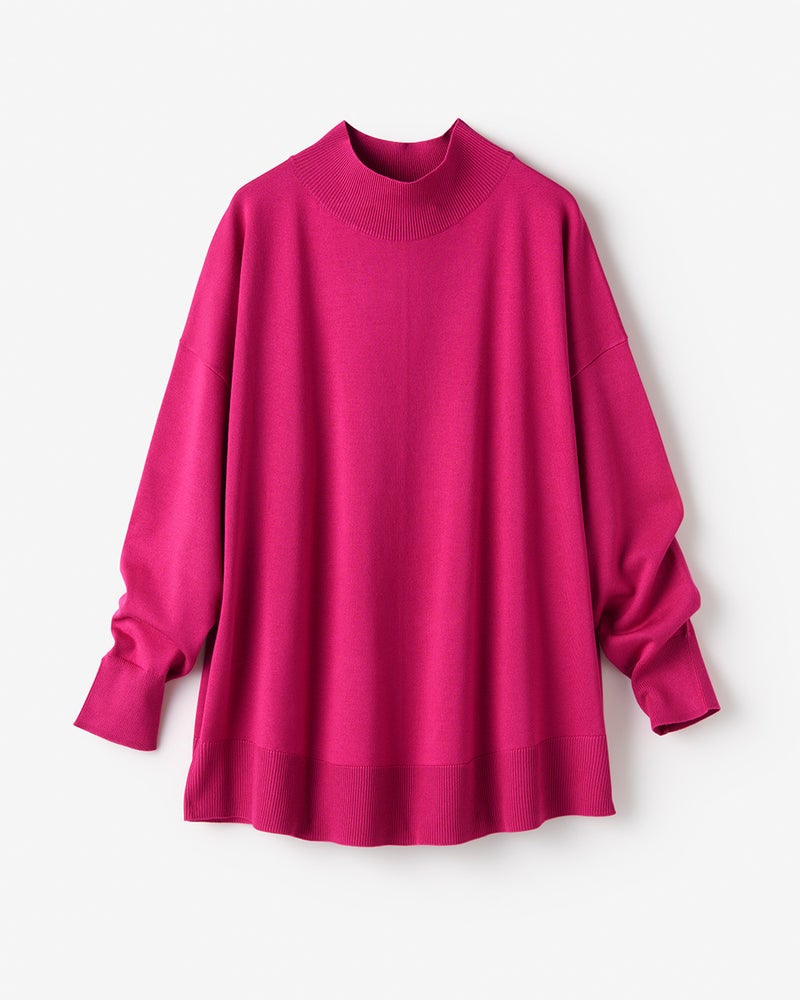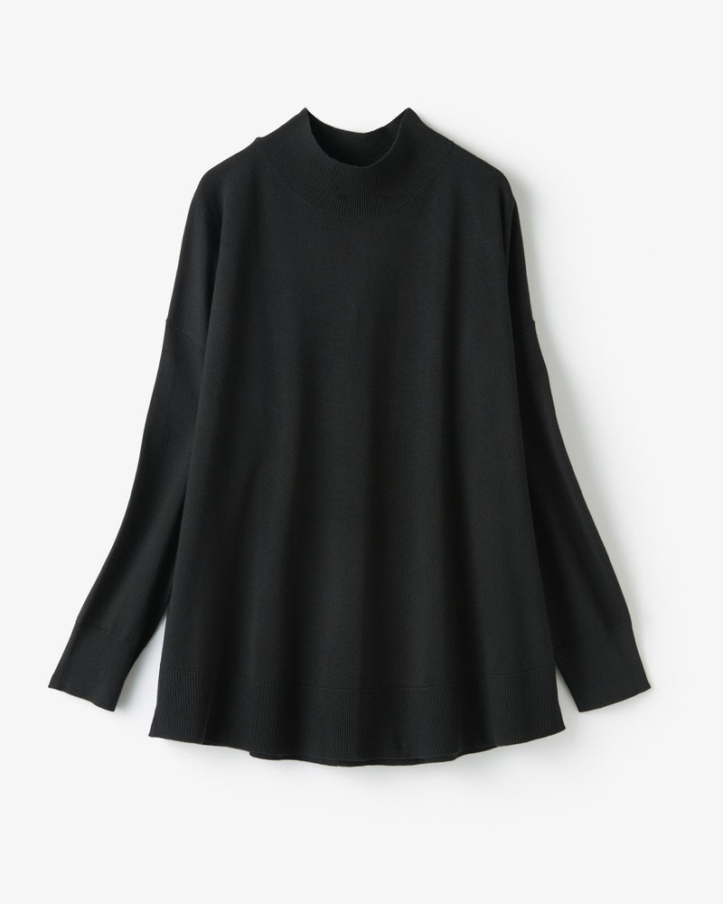 普段のサイズ:M 着用サイズ:M- 身体のラインを拾わないボックスシルエットでなめらかで着心地の良いニットです。ハイゲージで長い期間着られる素材感。ハイネックも首元が詰まり過ぎずドロップショルダーでリラックスした気持ちで今のお洒落を楽しめます。 パンツの他にツヤ感のあるスカートやタイトスカートにもとてもよく合う絶妙なサイズ感のニットです。