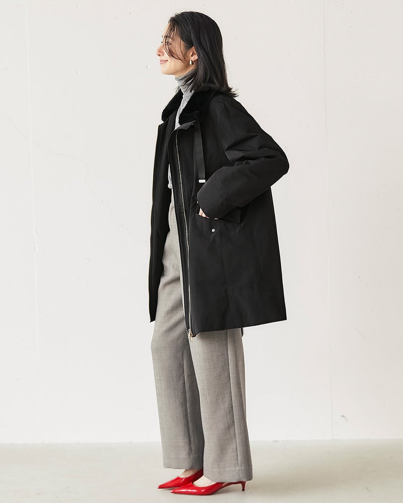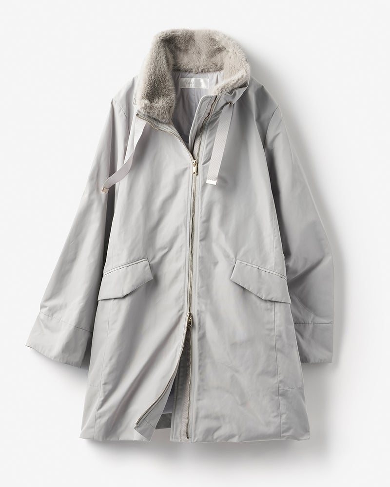 顔まわりに華やかさを添える「付けファー」仕立て衿の内側のエコファーは取り外し可能。気温やコーディネート、お好みによってアレンジできます。