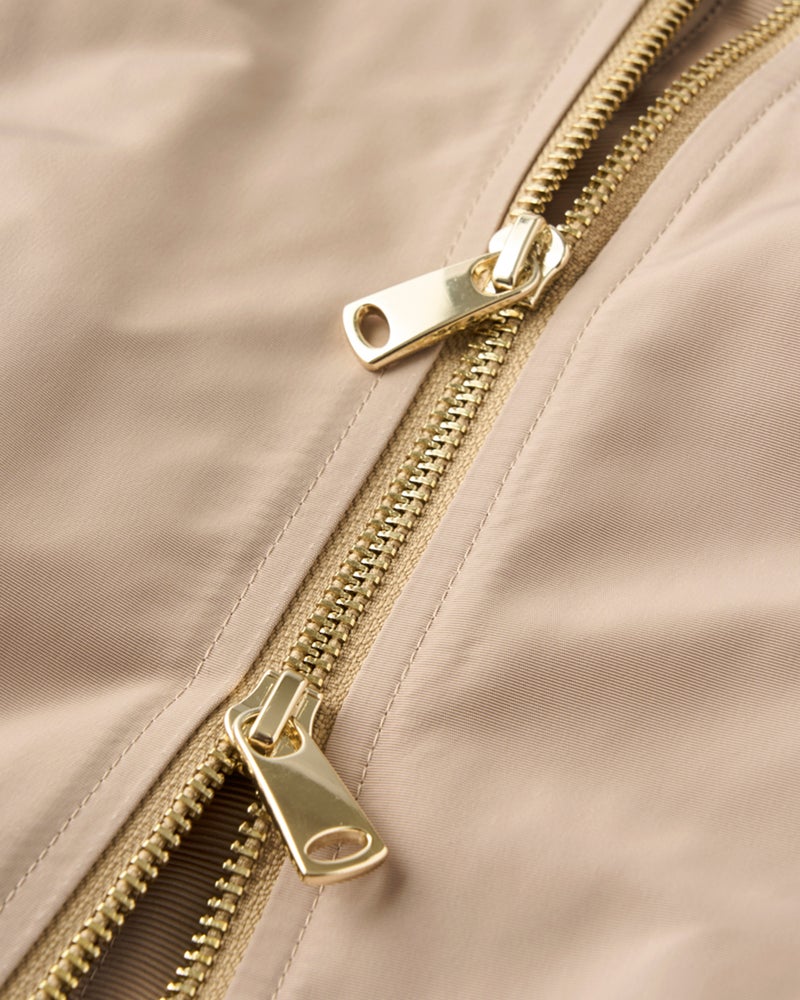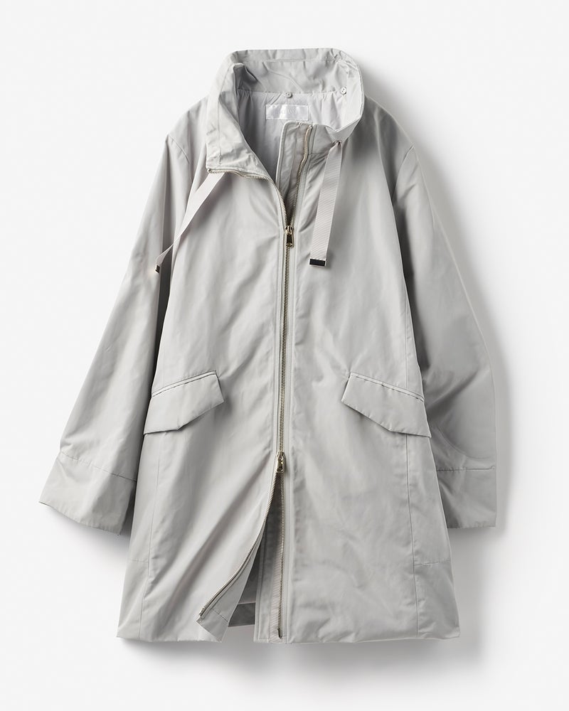 艶とハリのある、グログラン生地でもっと美しく緻密に織りあげた、ハリと艶の美しいグログラン素材をオモテ面に採用。より上質で、フォルムの美しさが際立つ1着に。オモテ面は雨や雪をはじく撥水加工済。裏面は光沢感のあるタフタ素材で、よりカジュアルな印象に。