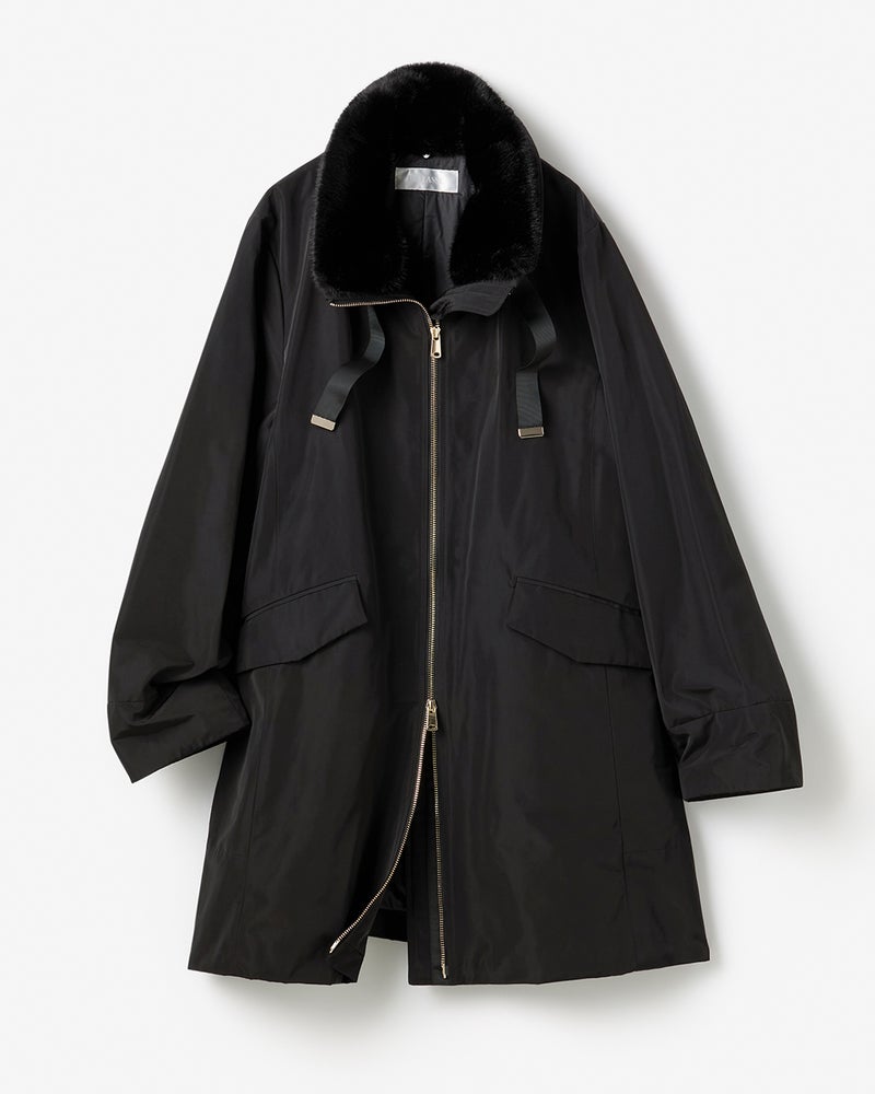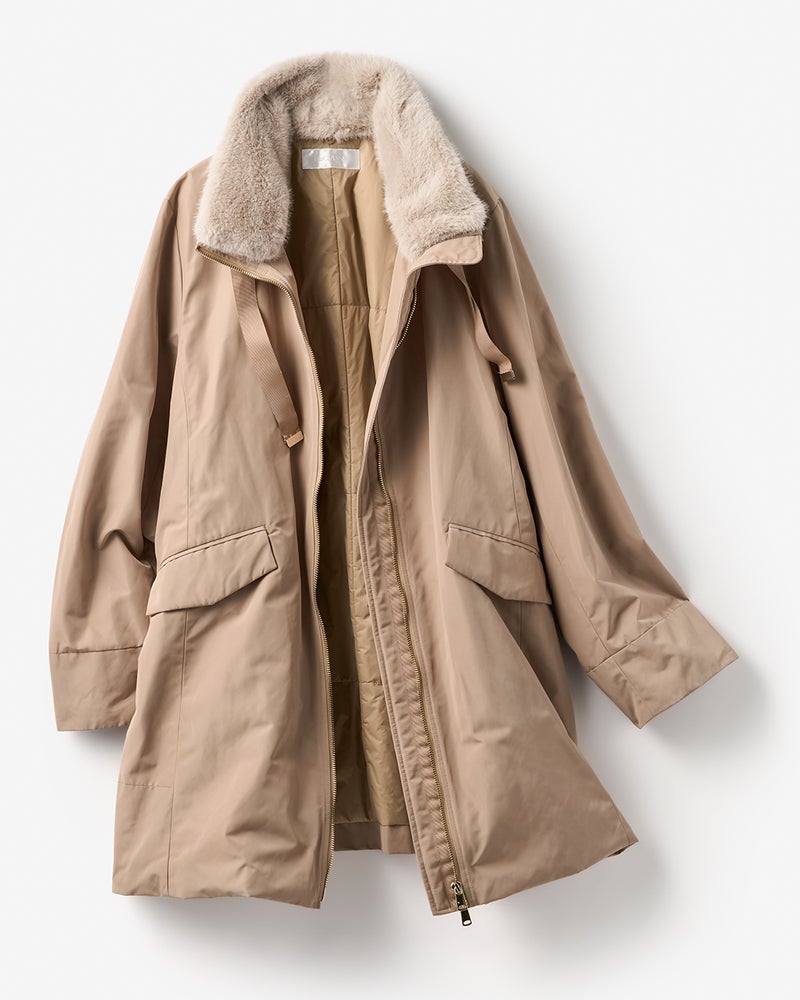 顔まわりに華やかさを添える「付けファー」仕立て衿の内側のエコファーは取り外し可能。気温やコーディネート、お好みによってアレンジできます。