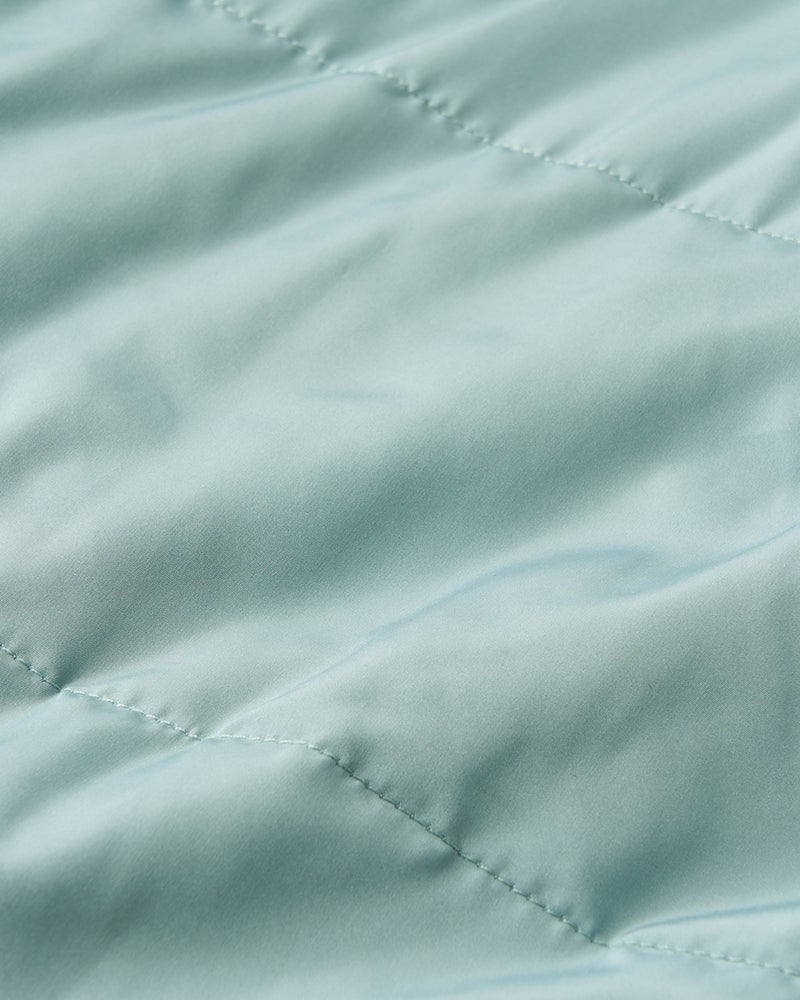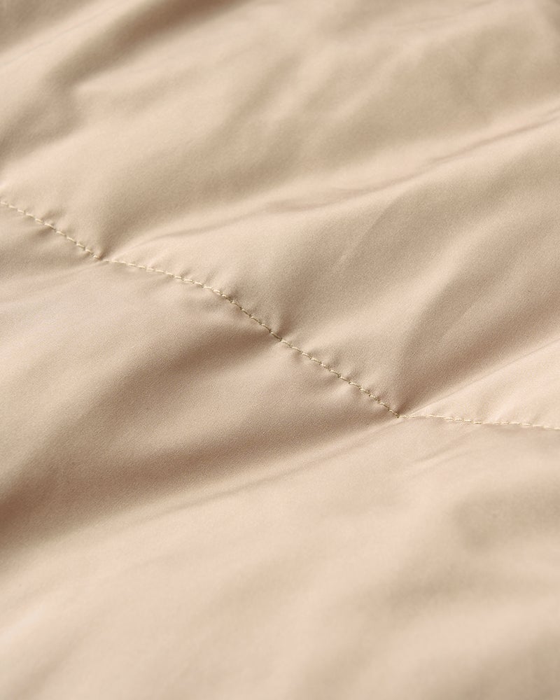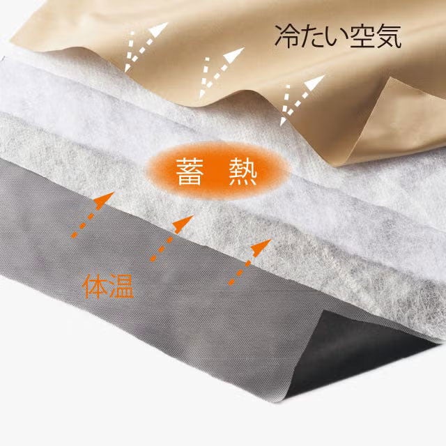 軽い、暖かいを両立させる多層構造繊維間に暖まった空気をしっかりキープする機能中綿を使用。これを特殊な加工をほどこしたポリエステルで包み込み、ダウン並みの暖かさを実現しています。