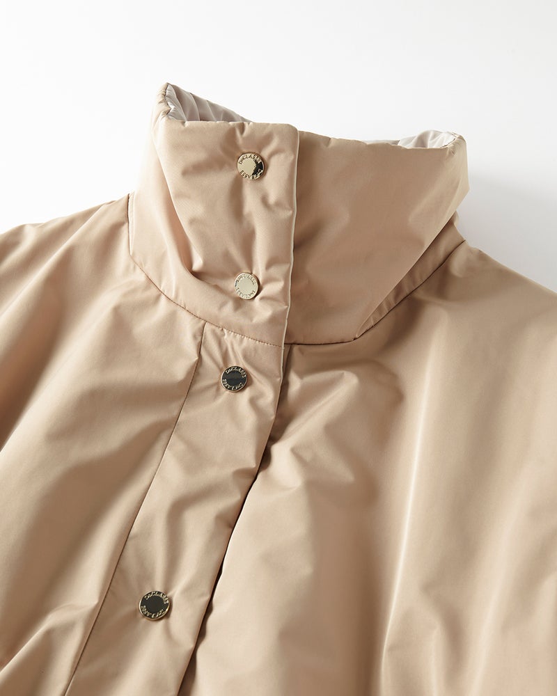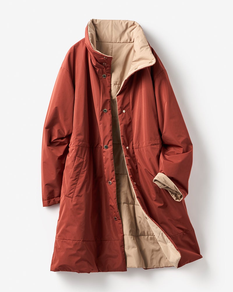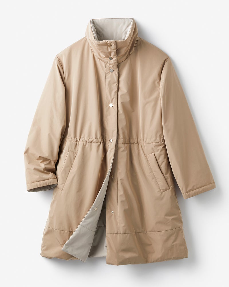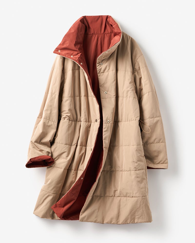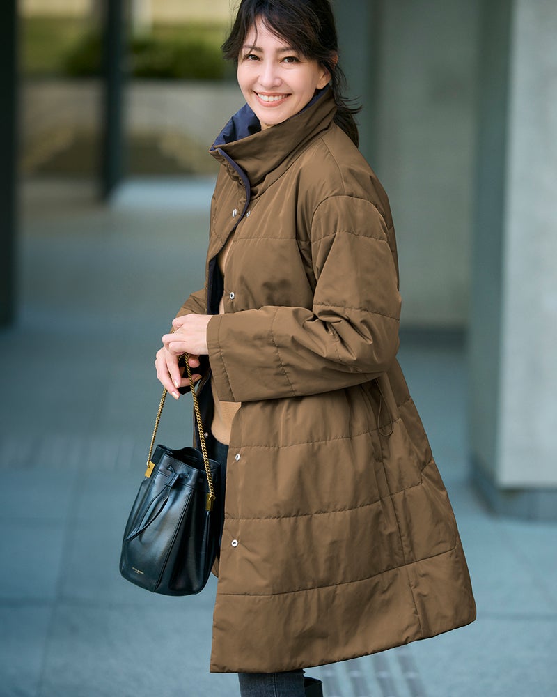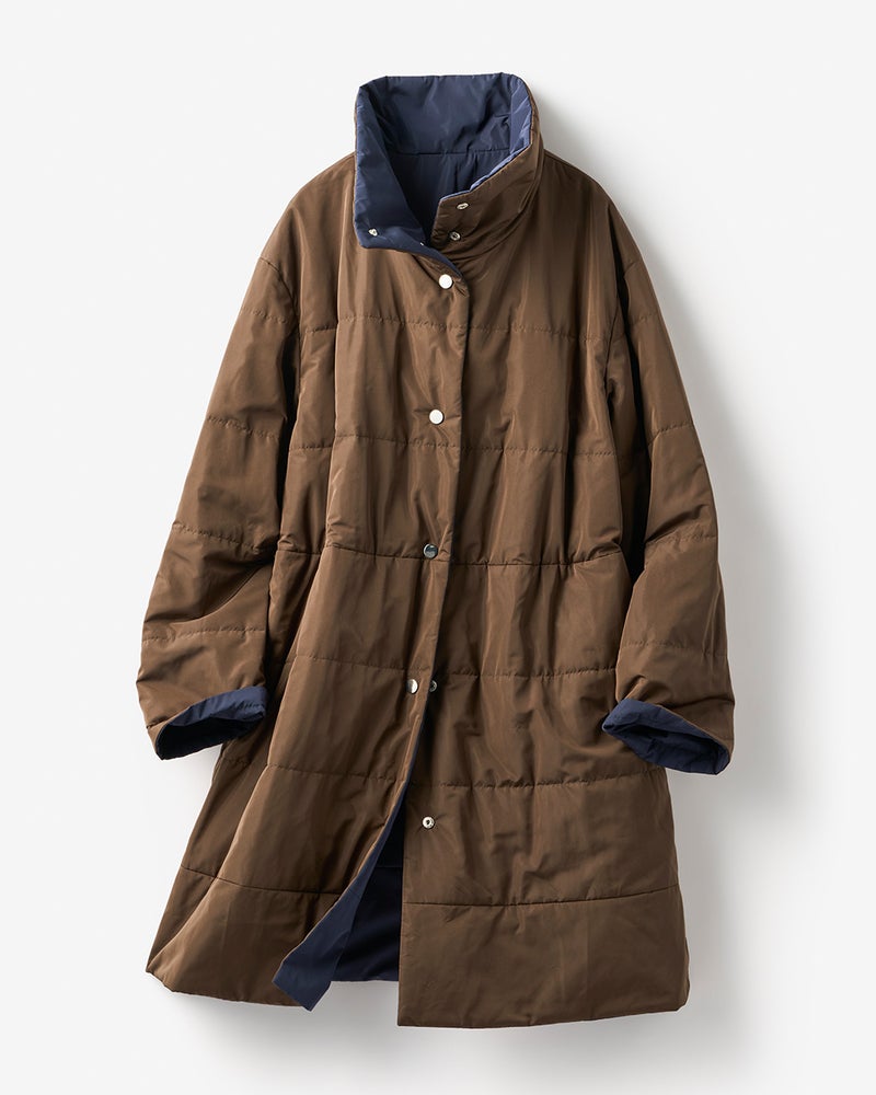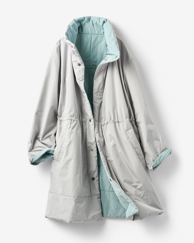 表面タフタの美光沢を堪能できるシンプルデザイン。内蔵コードでメリハリシルエットにも調節可能。 - 裏面裏面はキルティングを施したカジュアル使いにも似合うデザイン。膝上の長め丈はパンツからスカートまであらゆる着こなしに似合う万能スタイル。