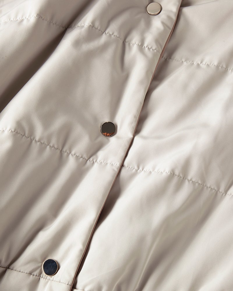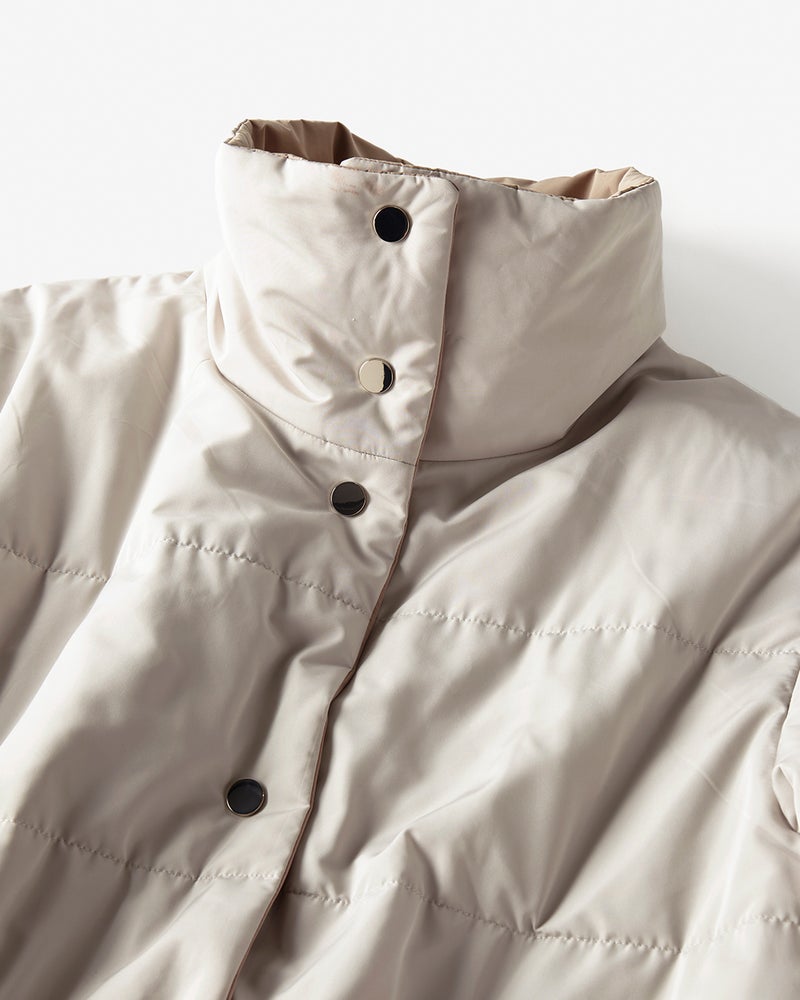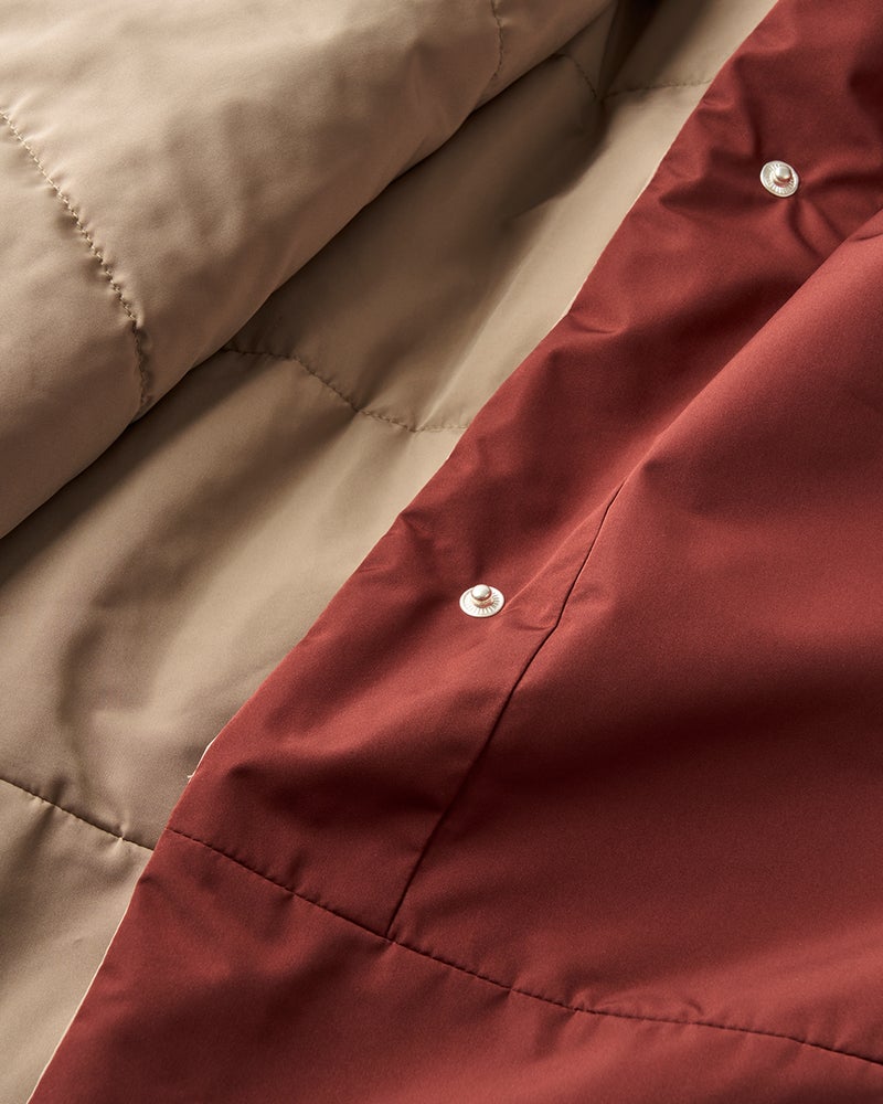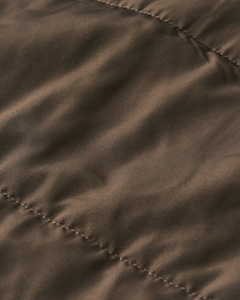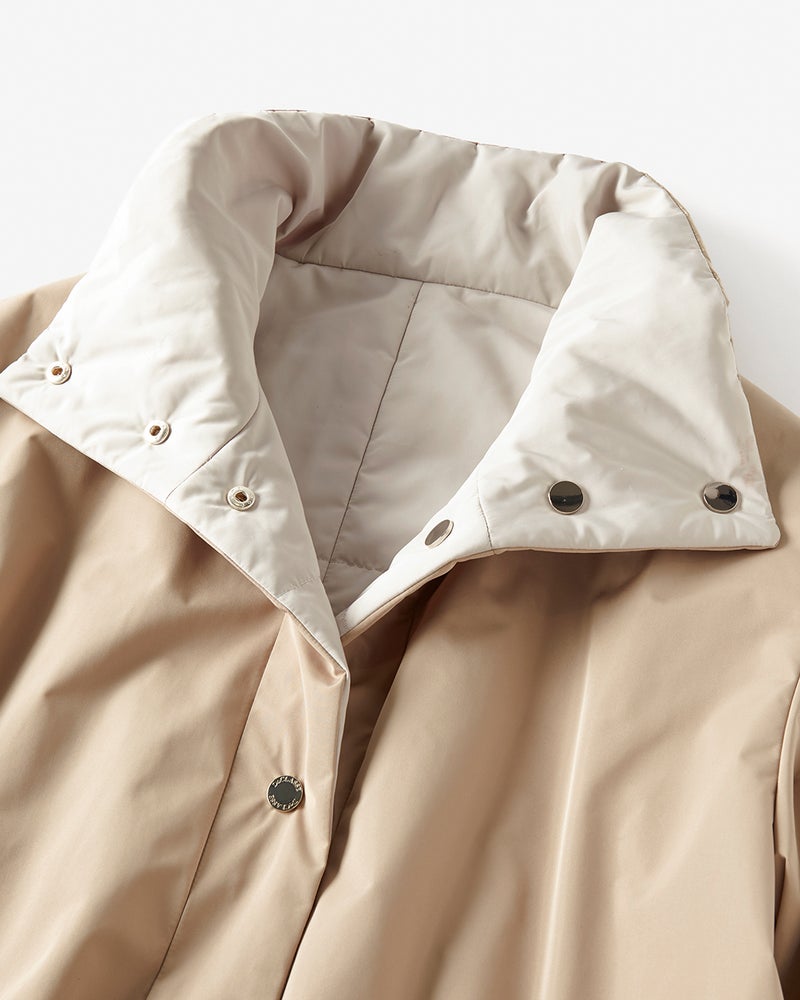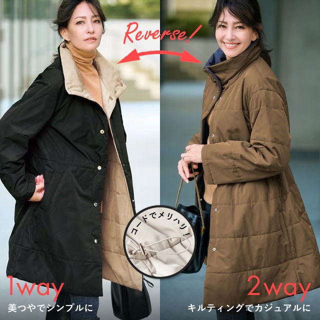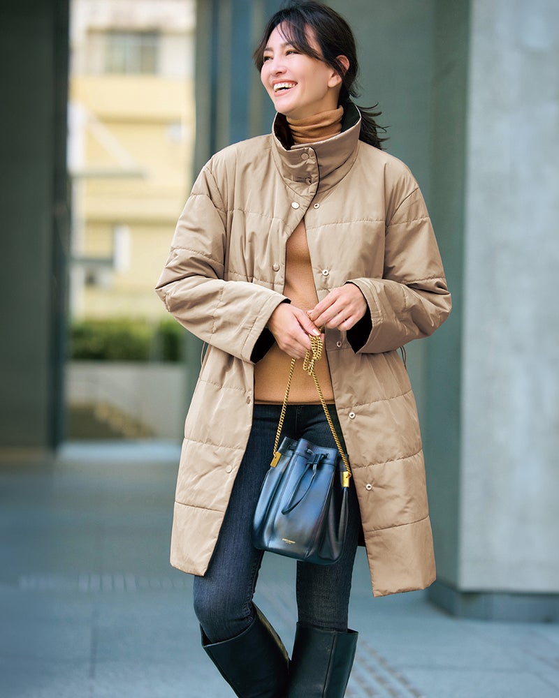 表面タフタの美光沢を堪能できるシンプルデザイン。内蔵コードでメリハリシルエットにも調節可能。 - 裏面裏面はキルティングを施したカジュアル使いにも似合うデザイン。膝上の長め丈はパンツからスカートまであらゆる着こなしに似合う万能スタイル。