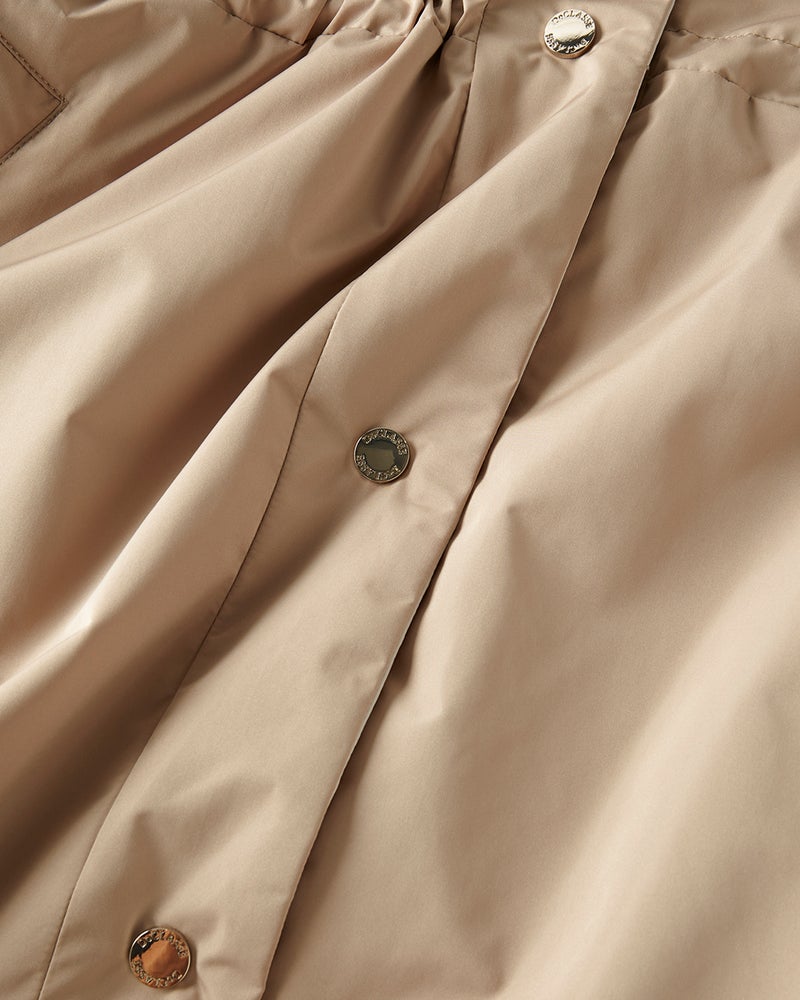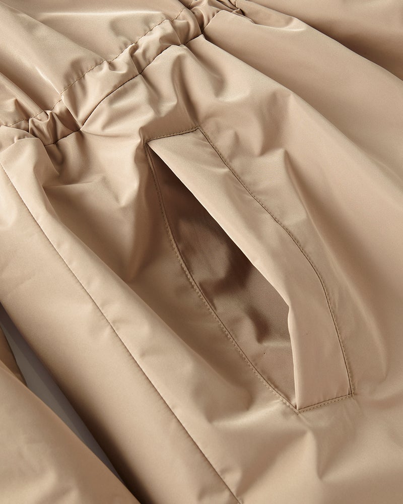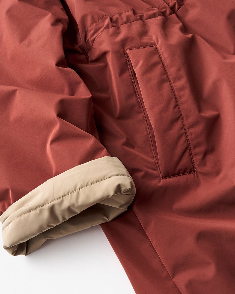 薄さと軽さにこだわった高密度タフタ両面とも、薄く軽量な高密度タフタ素材を使用。適度なハリと艶がありシャカシャカしな上品な質感が、大人の装いにマッチします。表側には撥水機能があります。