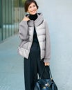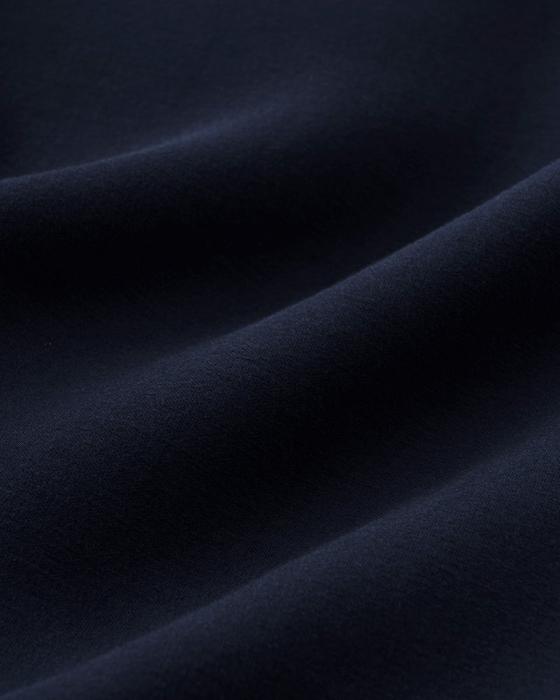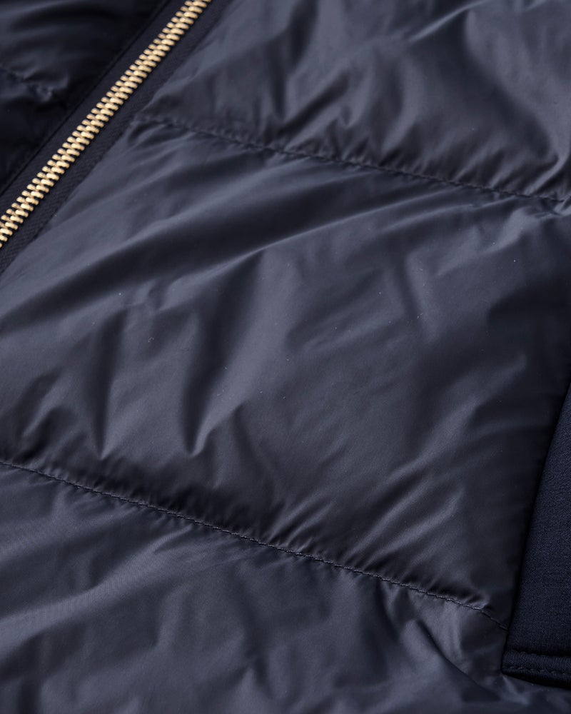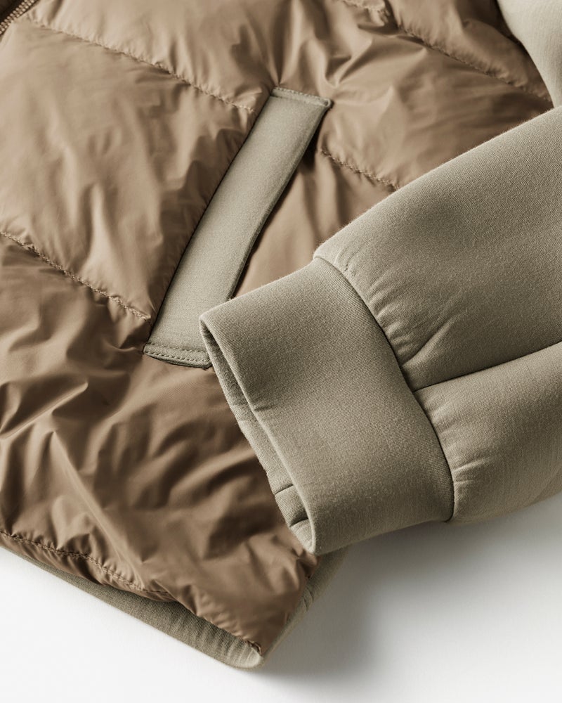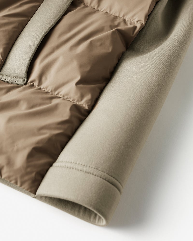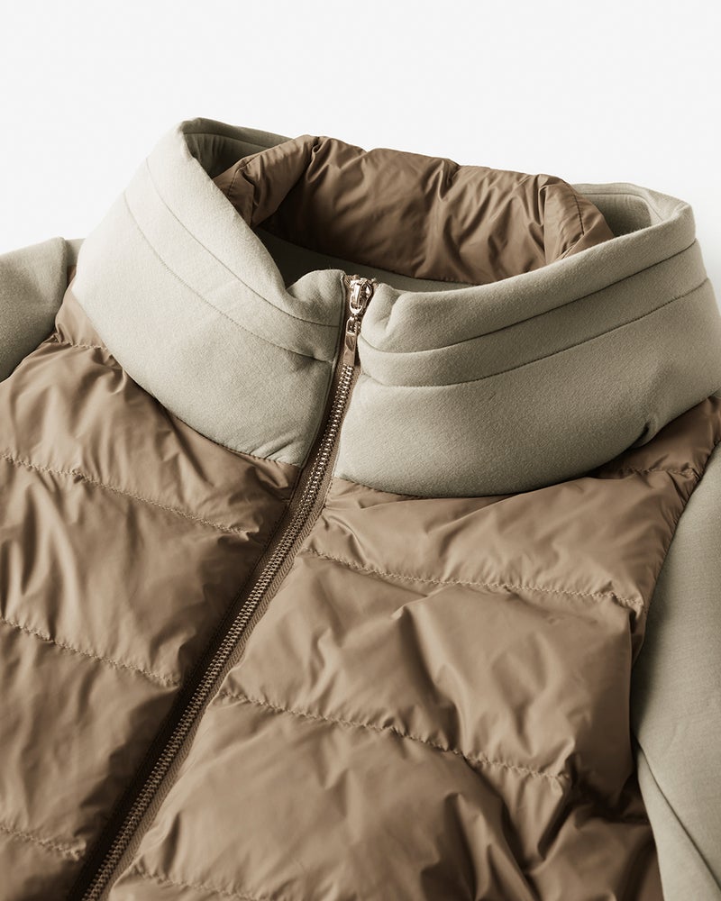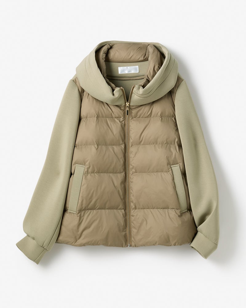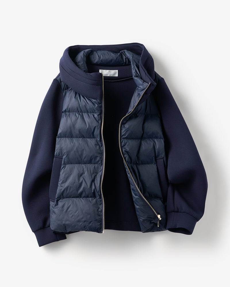 - 前身頃と衿の内側はエコダウン(中綿)入りのタフタ素材、後ろ身頃・袖・衿はダンボールジャージー素材のコンビデザイン。エコダウンの暖かさを享受しながら、動きやすく、ボリュームを抑えてスマートに見せてくれます。立体感のあるフード風のスタンドカラーが顔まわりにニュアンスを生み、小顔効果抜群。