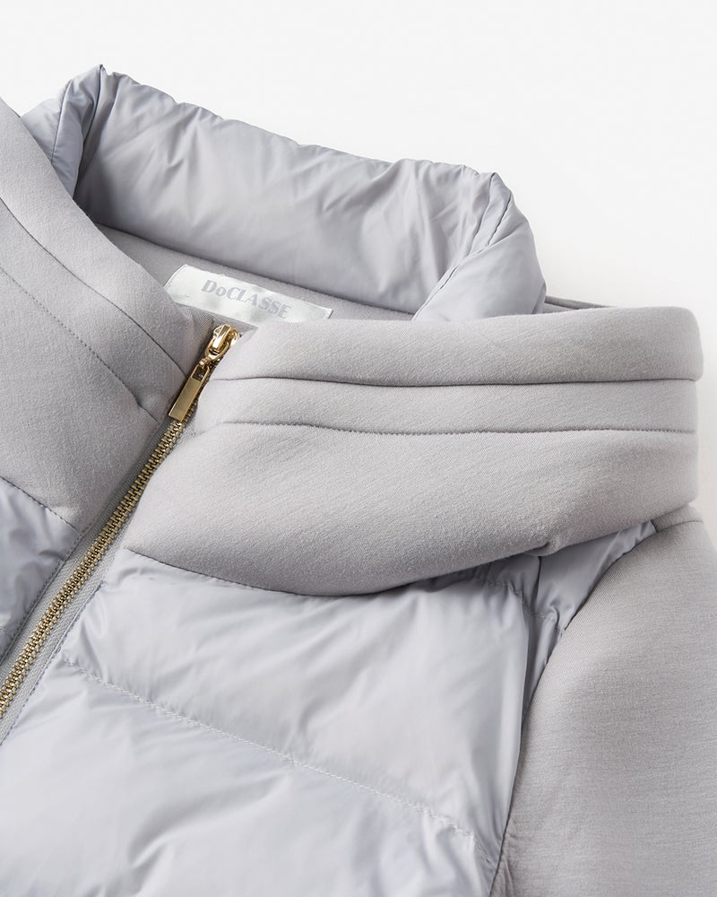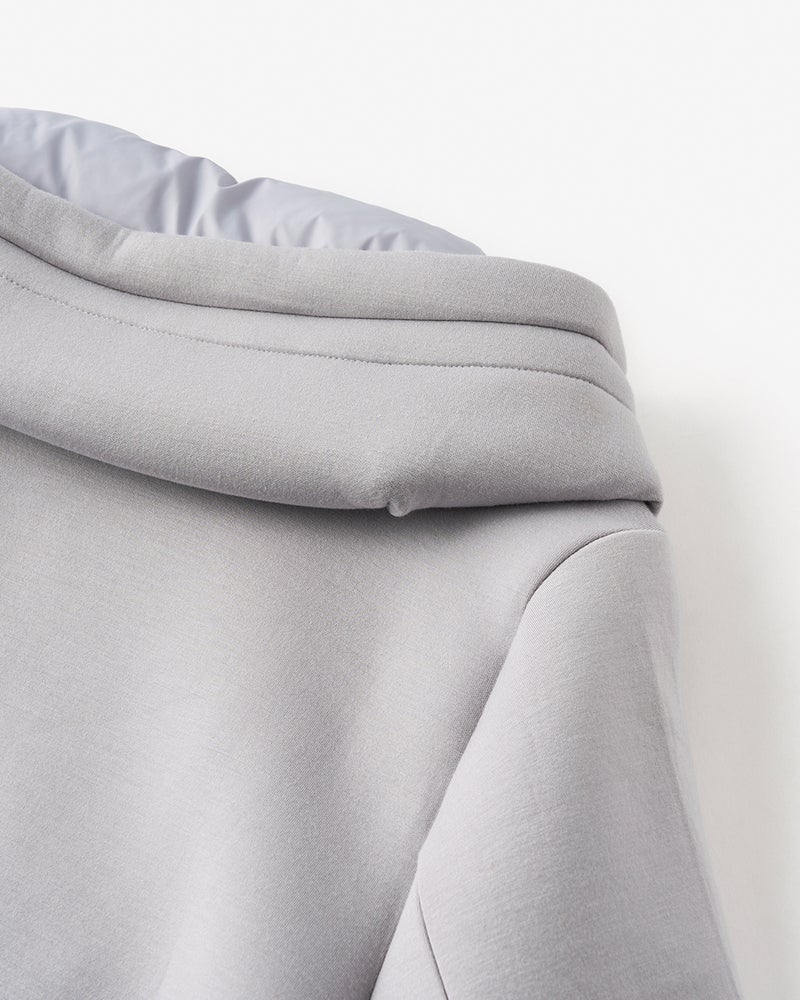 フード見えスタンドカラーエコダウン入りのスタンドカラーにダンボールジャージー素材を重ね、ふっくらしたニュアンスのある衿に仕立てました。フードではカジュアルすぎるという方も、フードのような立体感と小顔効果を大人っぽく楽しめます。