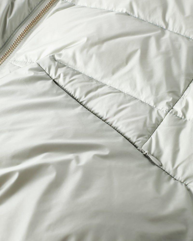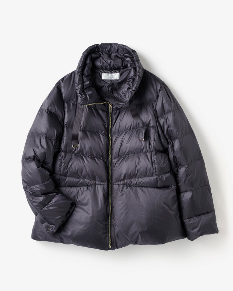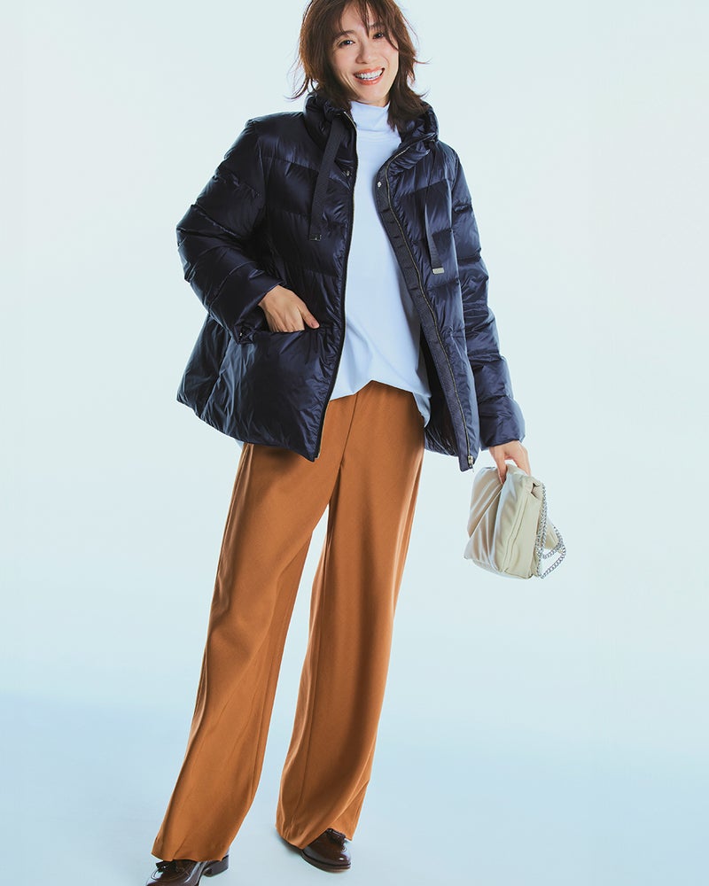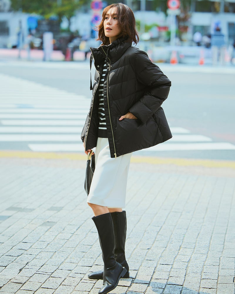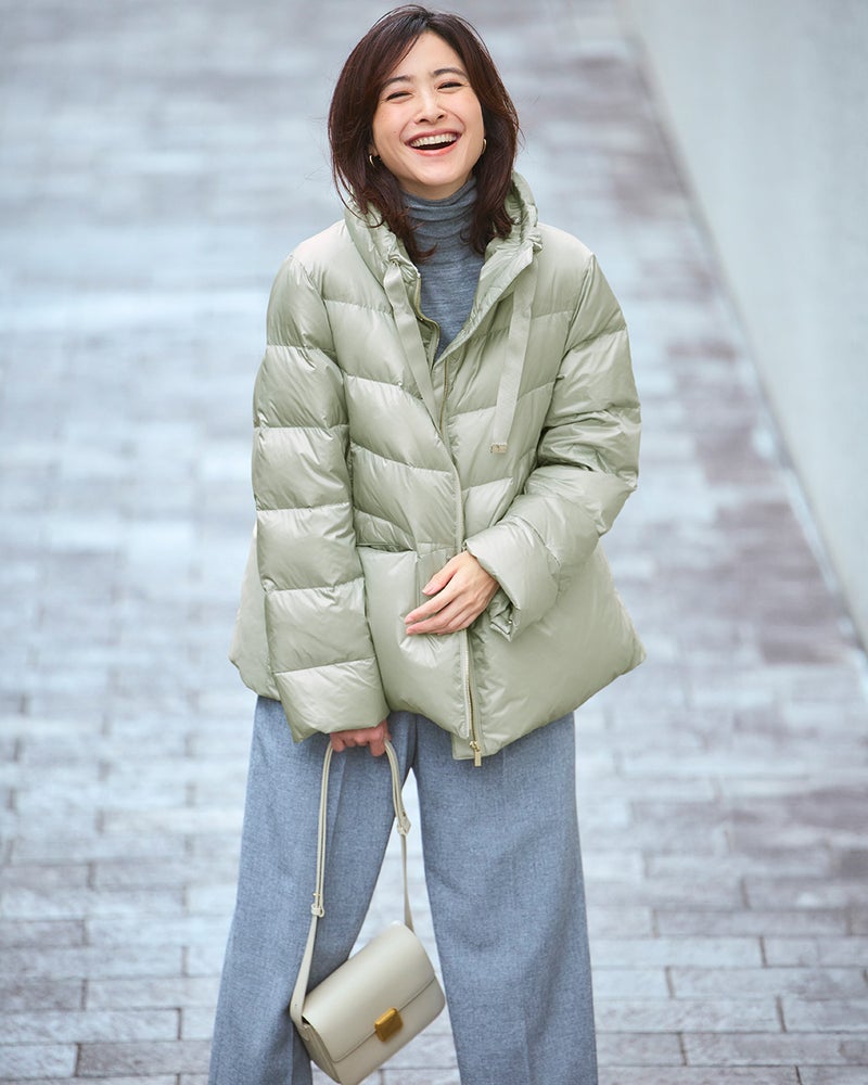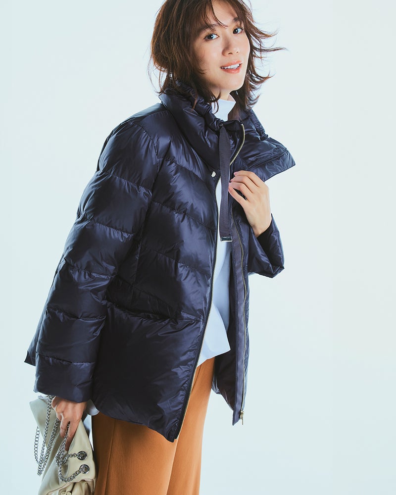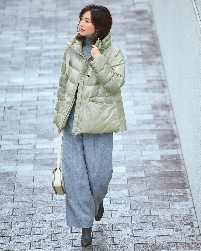 - 生地の決め手になったのは、美人印象を授ける「ツヤ」着映えを叶えるのは、華やかな艶をまとった20デニールのタフタ生地。ハイブランドのダウンにも使われる上質な生地は、ほんのり透明感があって、見た目もすっきり軽やかな印象です。衿ぐりゆったりのスタンドカラーには、顔まわりをカバーして小顔を演出する効果が。衿を開くと優しい印象になり、その日の気分でアレンジをお楽しみいただけます。