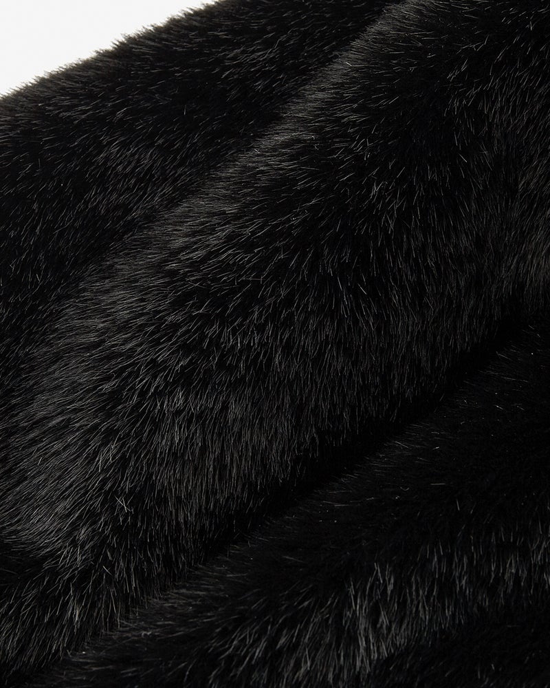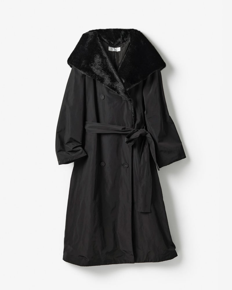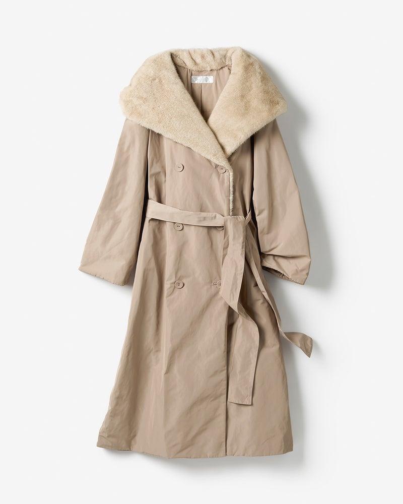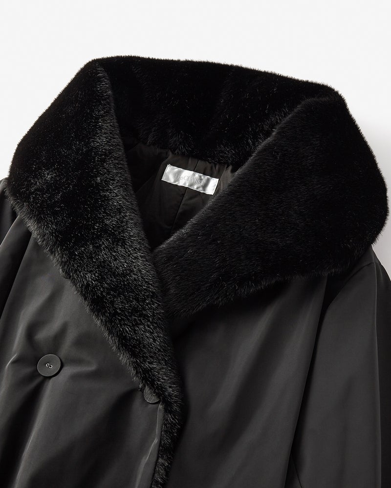 衿裏にみっしりエコファーをあしらい、2WAYで印象を変えられる衿デザイン