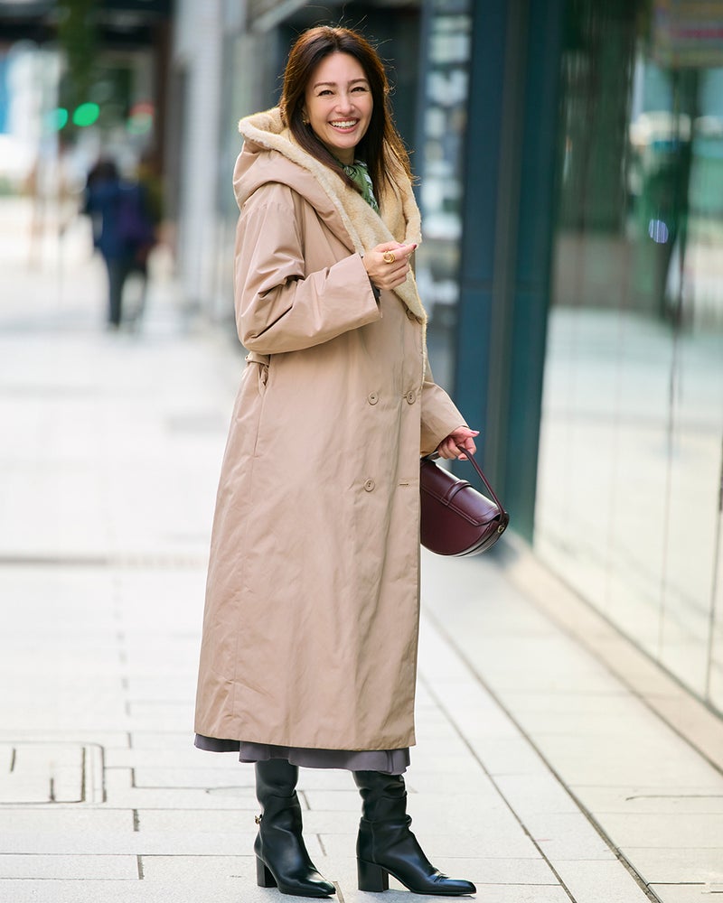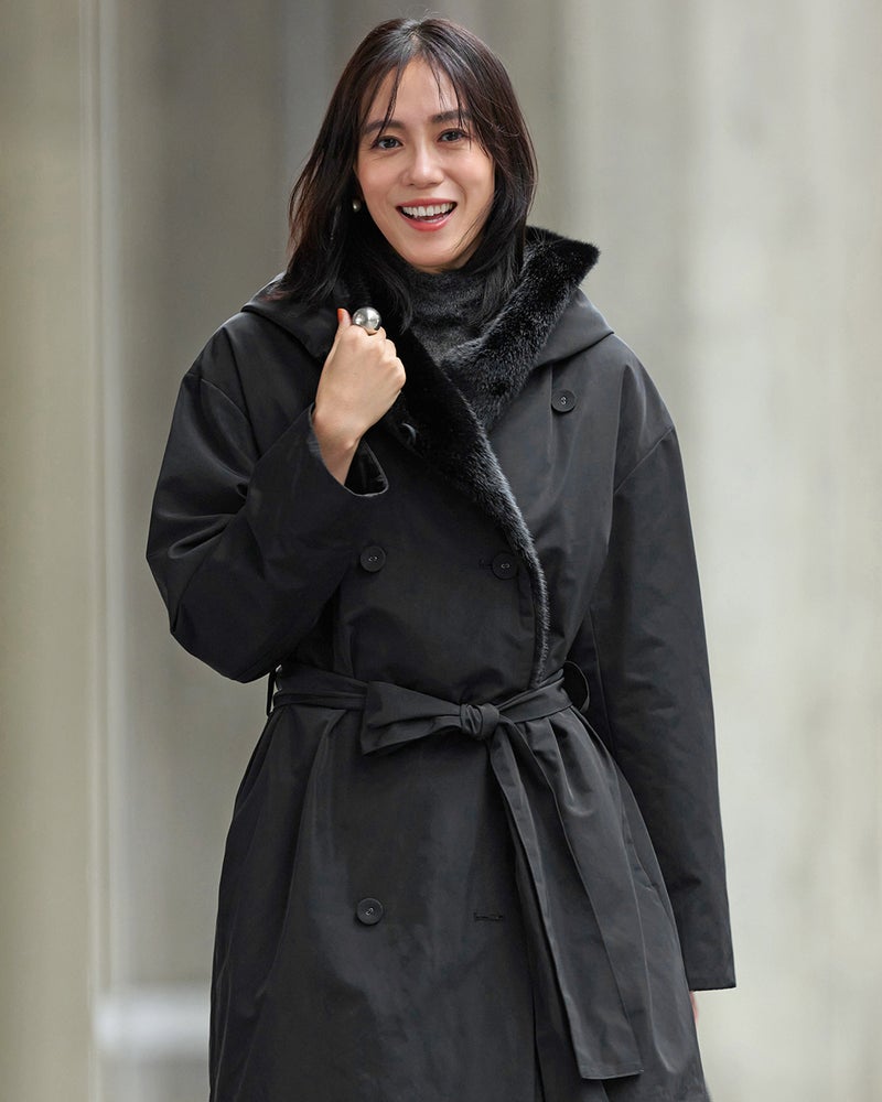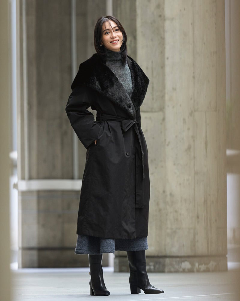 確かな暖かさと着膨れしないシルエットで人気の「マジカルサーモ」。グログラン素材の上品な艶感と衿裏一面にあしらったエコファーで、エレガントなルックスを叶えました。ガウンのように羽織っても、ベルトを締めてもドレスライクな印象に。衿のアレンジでフード風にもショールカラーにもなり、着こなしによって印象チェンジが可能です。