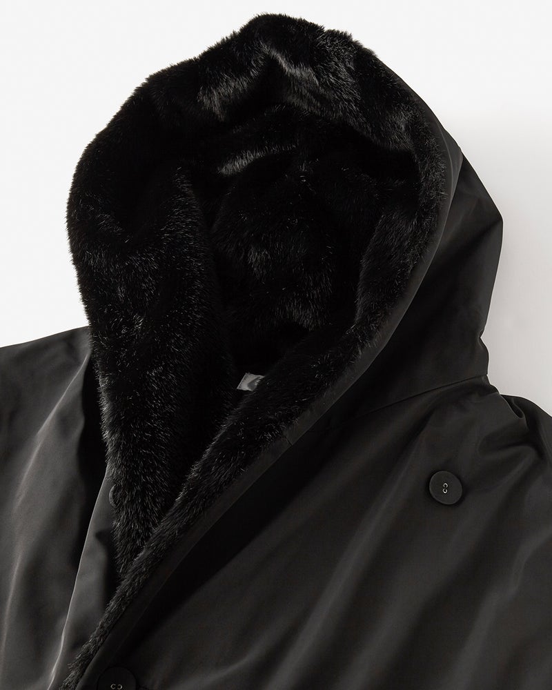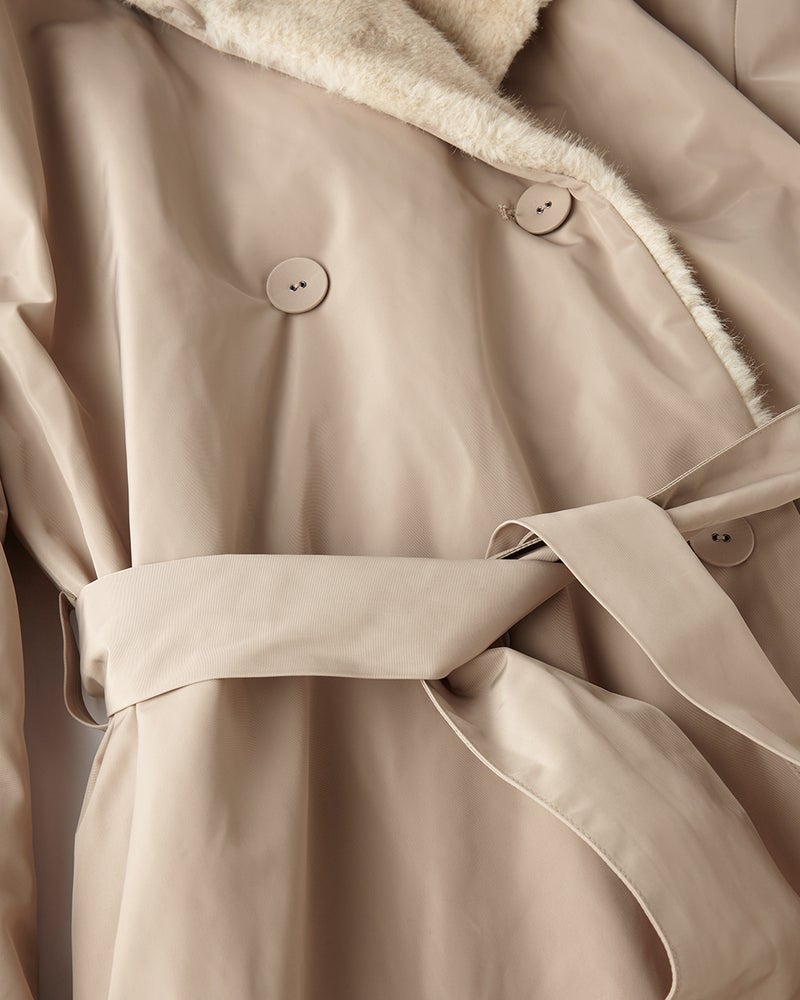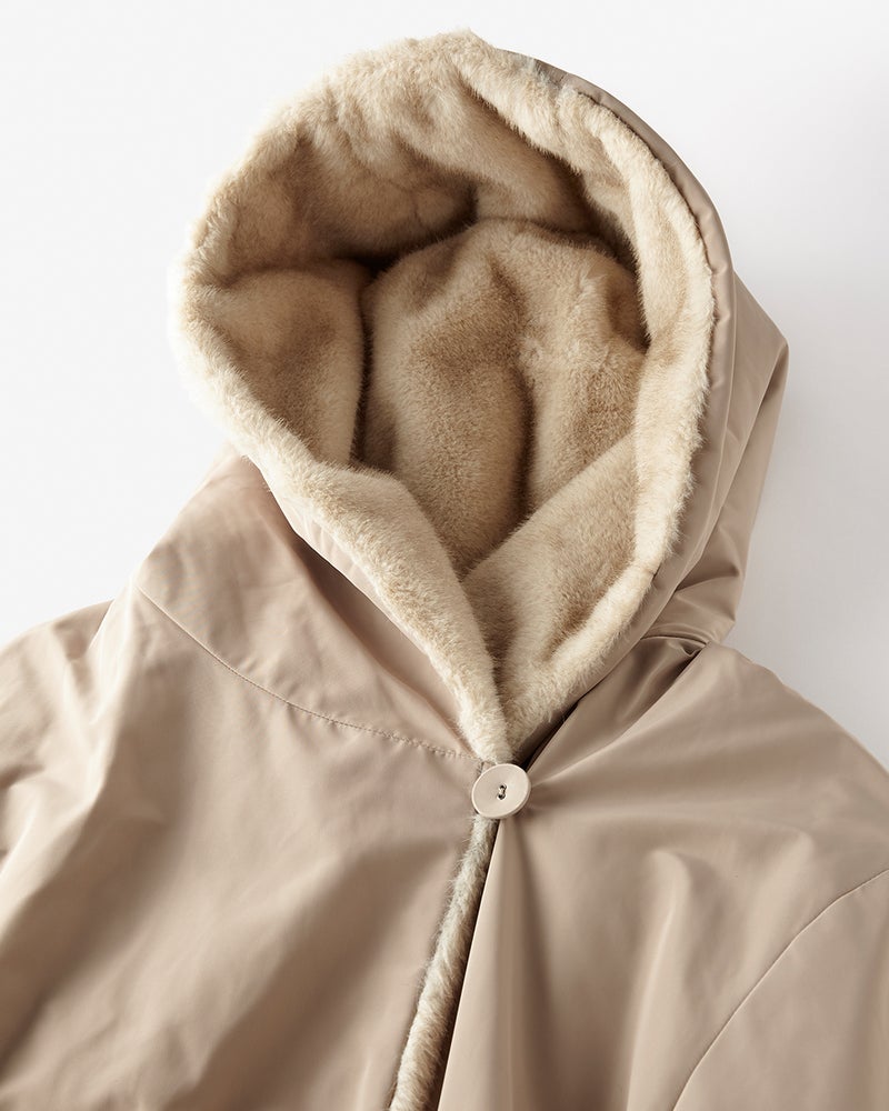 衿の裏にあしらったエコファーが顔まわりを華やかに演出。衿を外側に広げればフード風に、内側に折り込めばショールカラー風にチェンジできる2WAY。お好みによってアレンジできます。