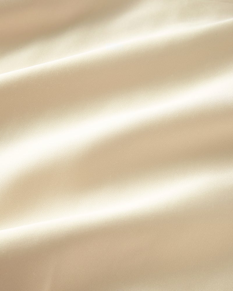 フラップポケットがアクセントのスポーティなブルゾンジャケットを、艶やかなサテン素材でフェミニンに。アームホールが広めで厚手ニットにもはおりやすく、短めの着丈はロング丈のスカートやワンピースに合わせてもGOODバランス。後ろ裾のギャザーやゆったり仕立てたシルエット、そして金ボタンなど今っぽく着られるディテールも満載。