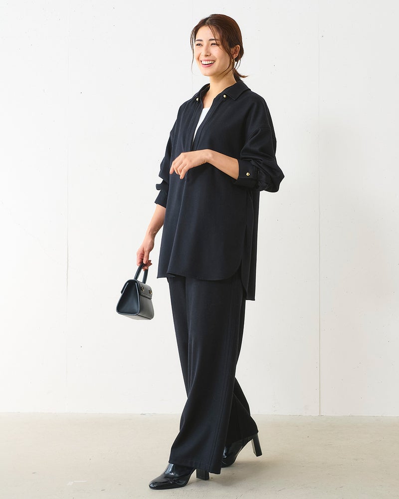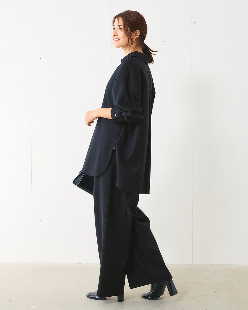 リュクスな素材を、あえてラフに着こなす。そんな大人の女性にこそ似合う着こなしを叶えるのが、なめらかな高密度フラノウールで仕立てたイージーワイドパンツ。微光沢を放つ上質なウールの質感を活かすよう、すっきりとシンプルなワイドシルエットに。総ゴム仕立ての快適な着心地はカジュアルなスタイルはもちろん、同素材のブラウス(商品番号 32221)と合わせたお出かけスタイルにもおすすめです。