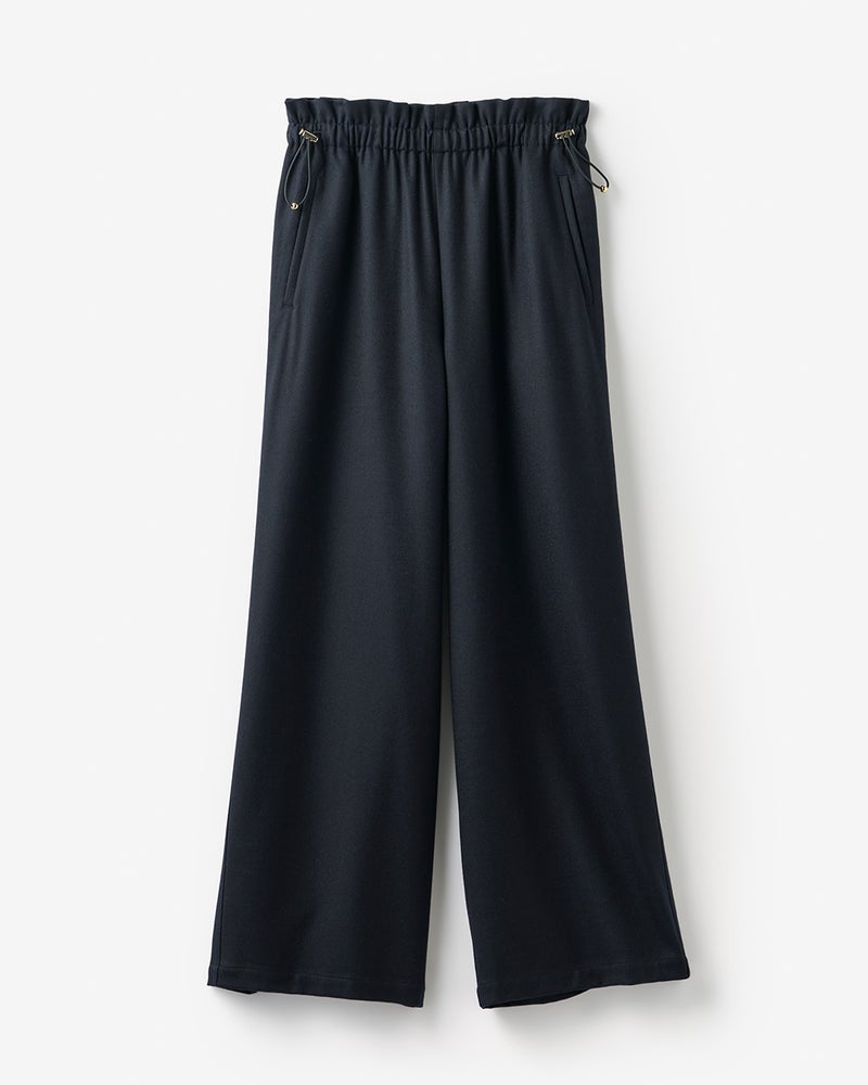 リュクスな素材を、あえてラフに着こなす。そんな大人の女性にこそ似合う着こなしを叶えるのが、なめらかな高密度フラノウールで仕立てたイージーワイドパンツ。微光沢を放つ上質なウールの質感を活かすよう、すっきりとシンプルなワイドシルエットに。総ゴム仕立ての快適な着心地はカジュアルなスタイルはもちろん、同素材のブラウス(商品番号 32221)と合わせたお出かけスタイルにもおすすめです。